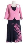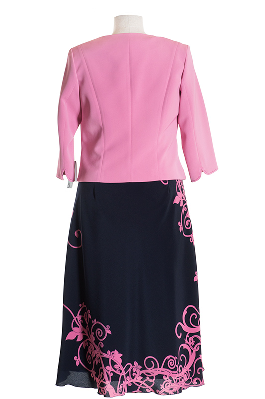 BRIGITTE to damski komplet wizytowy. Składa się z wielobarwnej, wzorzystej sukni oraz pasującego do niej żakietu. Żakiet ma rękawki 3/4 i jest zapinany na dwa guziczki. Dodatkowym ozdobnym elementem zestawu jest tekstylny kwiat, przypięty do żakietu.
