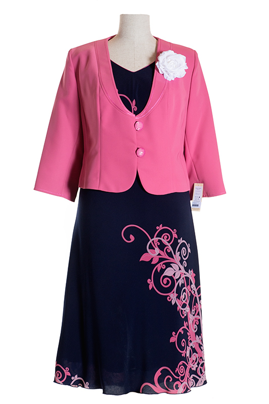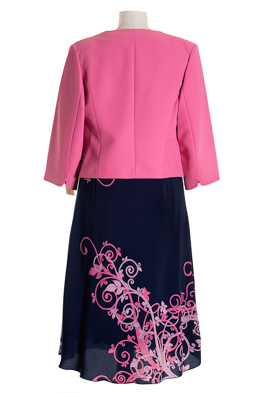 BRIGITTE to damski komplet wizytowy. Składa się z wielobarwnej, wzorzystej sukni oraz pasującego do niej żakietu. Żakiet ma rękawki 3/4 i jest zapinany na dwa guziczki. Dodatkowym ozdobnym elementem zestawu jest tekstylny kwiat, przypięty do żakietu.