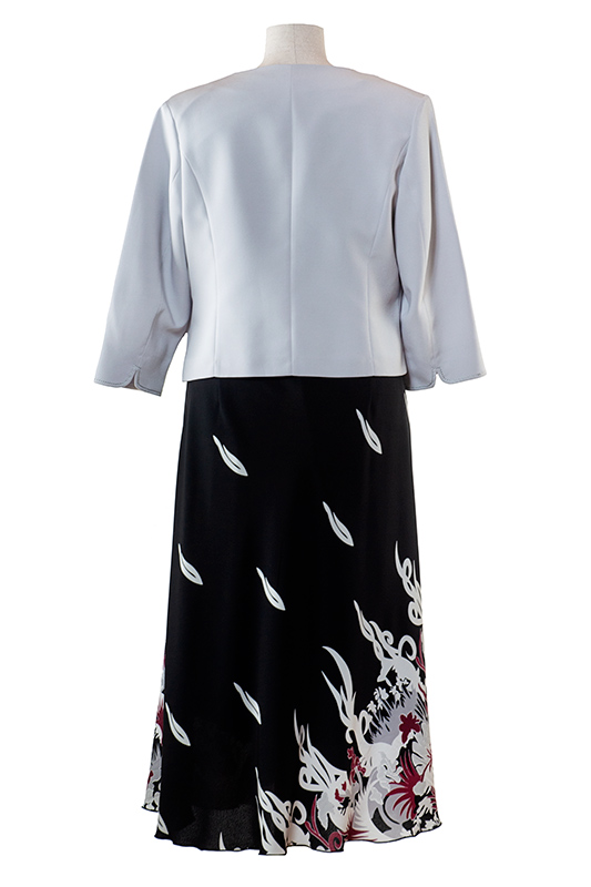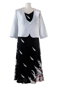 BRIGITTE to damski komplet wizytowy. Składa się z wielobarwnej, wzorzystej sukni oraz pasującego do niej żakietu. Żakiet ma rękawki 3/4 i jest zapinany na dwa guziczki. Dodatkowym ozdobnym elementem zestawu jest tekstylny kwiat, przypięty do żakietu.
