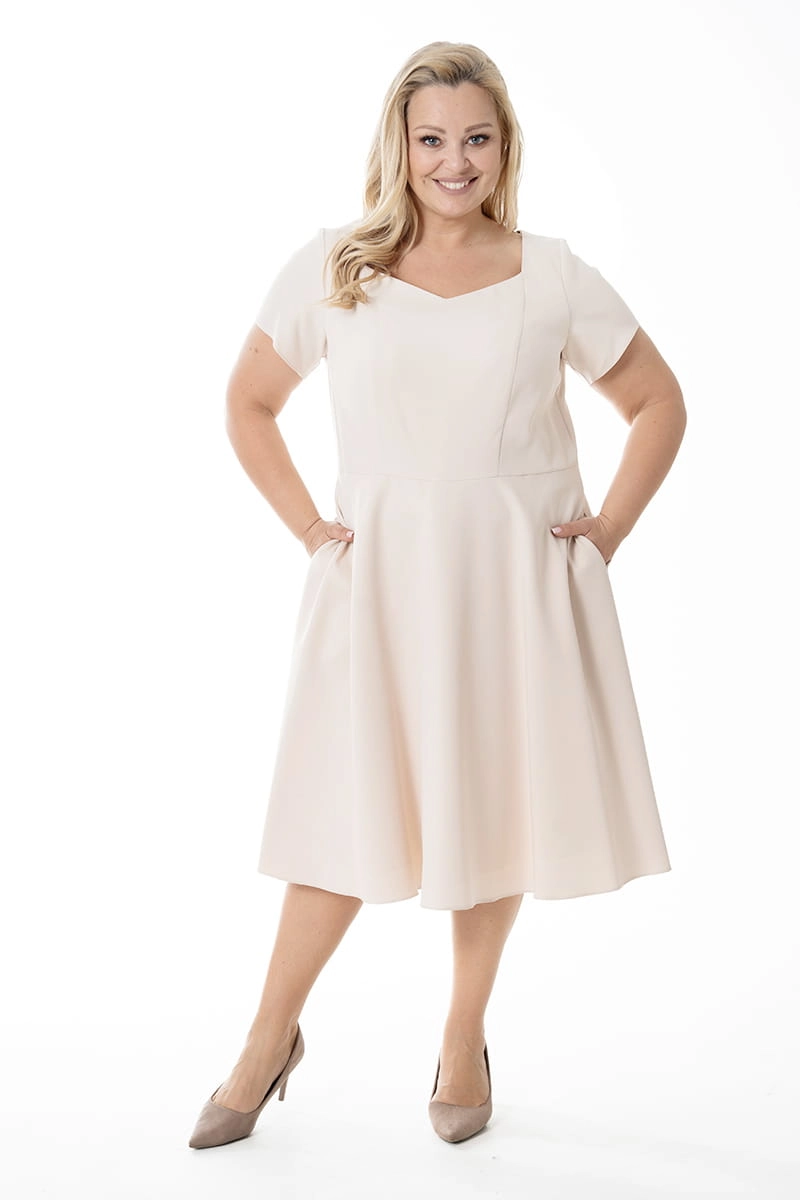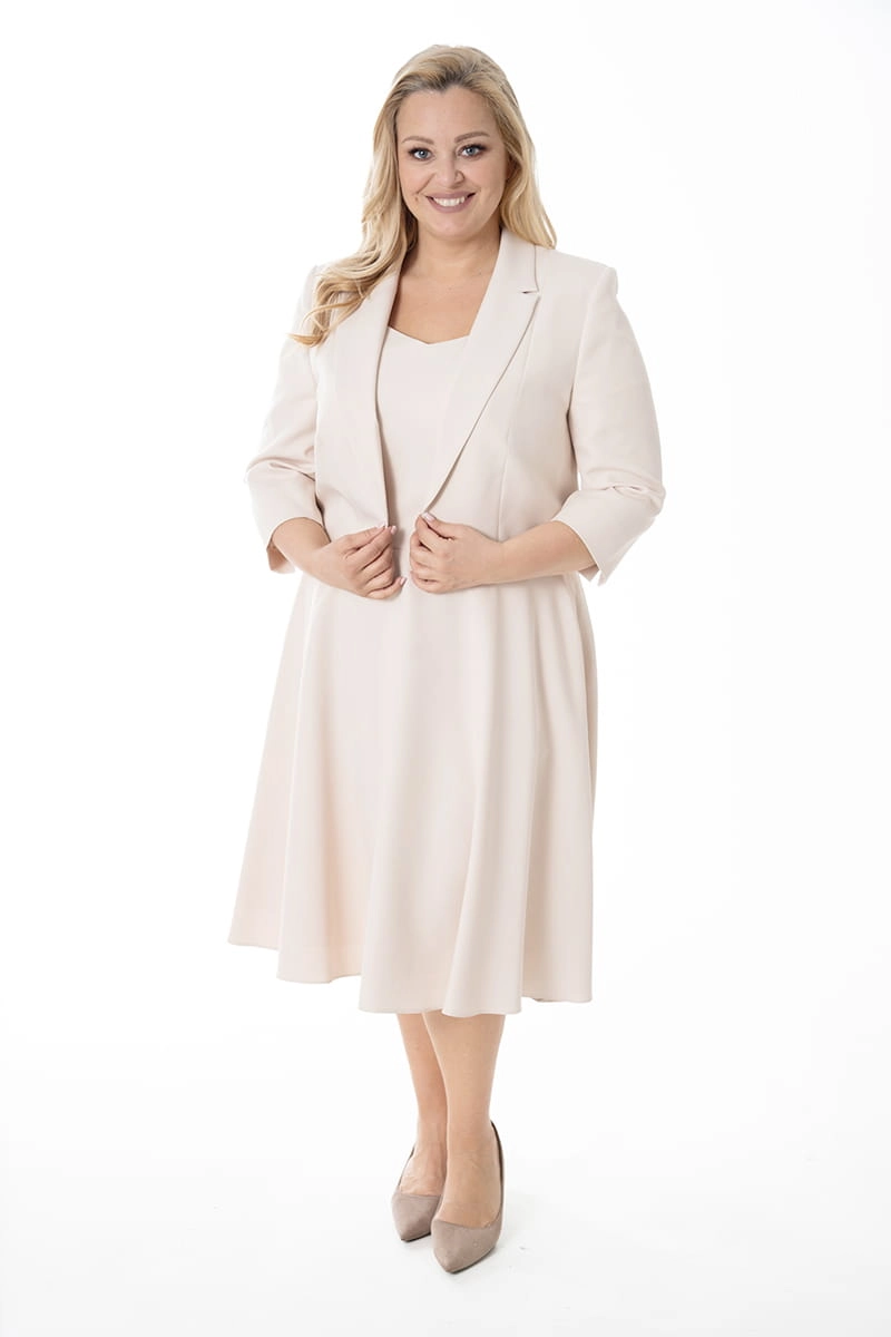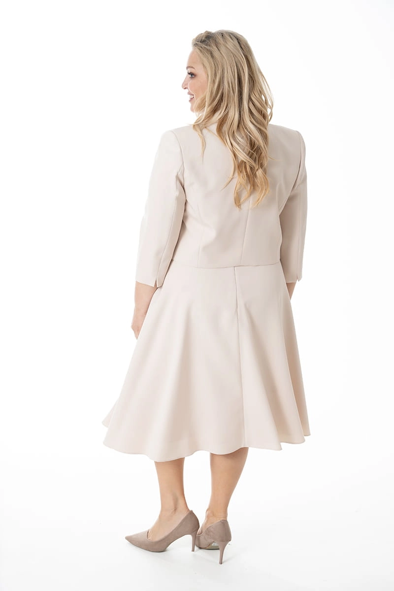 Kler nawiązuje stylistyką do lat 50 i pięknie modeluje kobiecą sylwekę. Odcinana w pasie sukienka ma krókie rękawki i piękny duży dekolt, kloszowy dół ładnie opływa biodra, w bocznych szwach natomiast ukryte zostały kieszenie. Z tyłu zapinana jest na zamek i odszyta podszewką. Krótki żakiet z rękawami długości 3/4 dopełnia całość stylizacji.