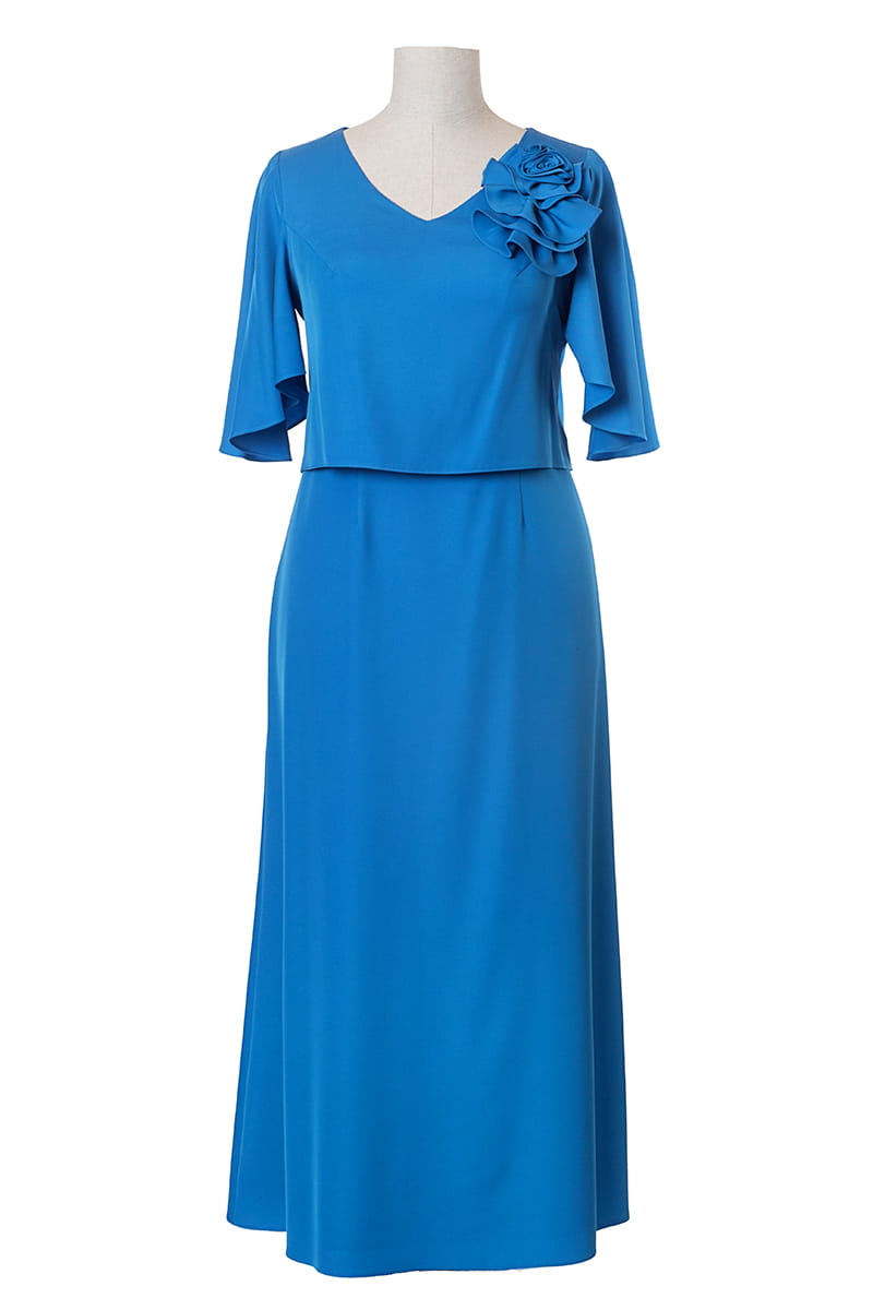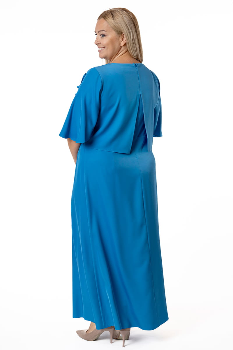Afrodyta to model dla kobiety, która lubi czuć się wyjątkowo, ale nie przepada z błyszczącymi kreacjami. Górna warstwa w formie przypominającej bluzkę opływa sylwetkę i ukrywa wszystkie fałdki, dekolt w kształcie litery "V" optycznie wydłuża szyję, Motylowe rękawy przykrywają ramiona, a uformowany kwiat stanowi najmodniejszą ozdobę. Długa suknia zapinana jest z tyłu na zamek błyskawiczny i odszyta podszewką.