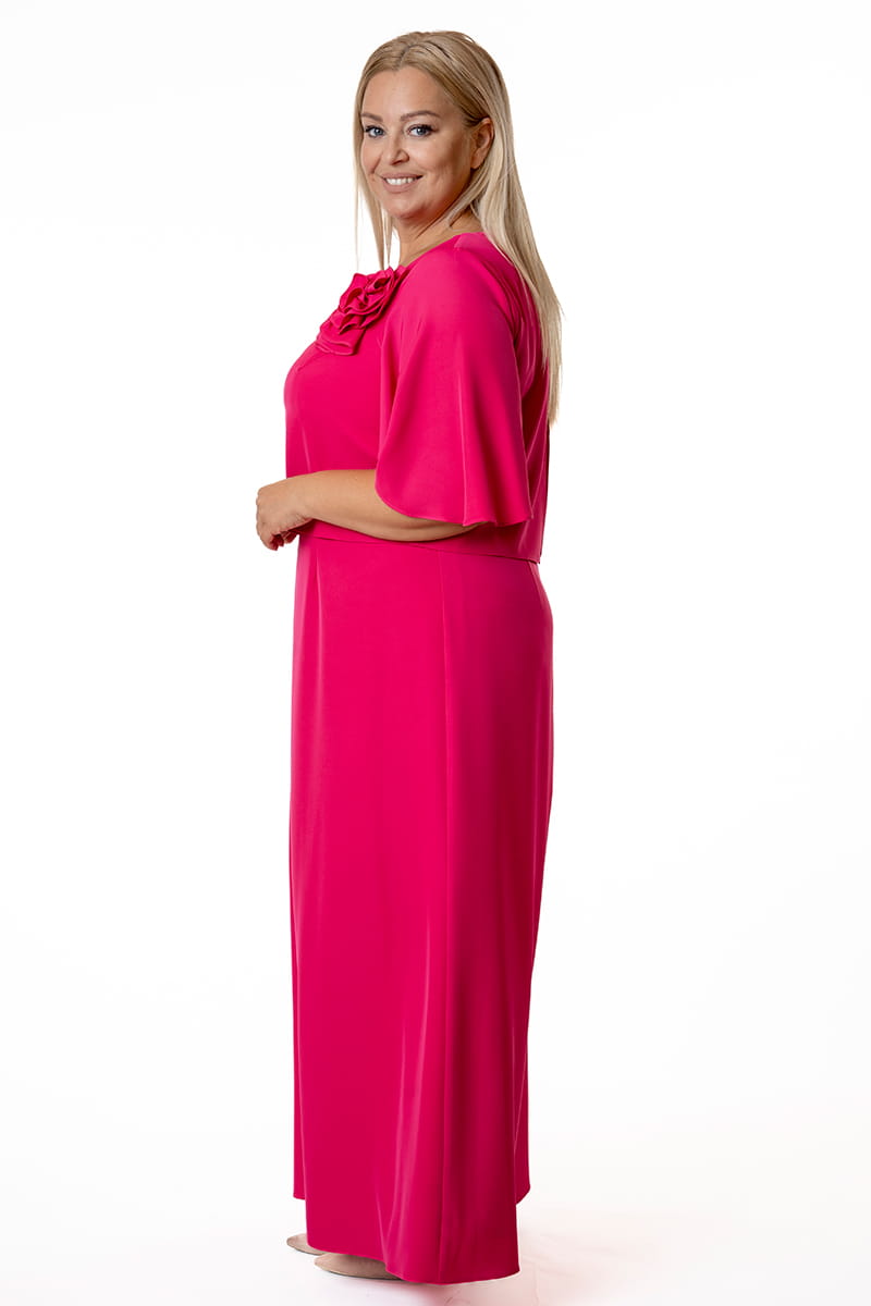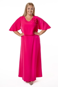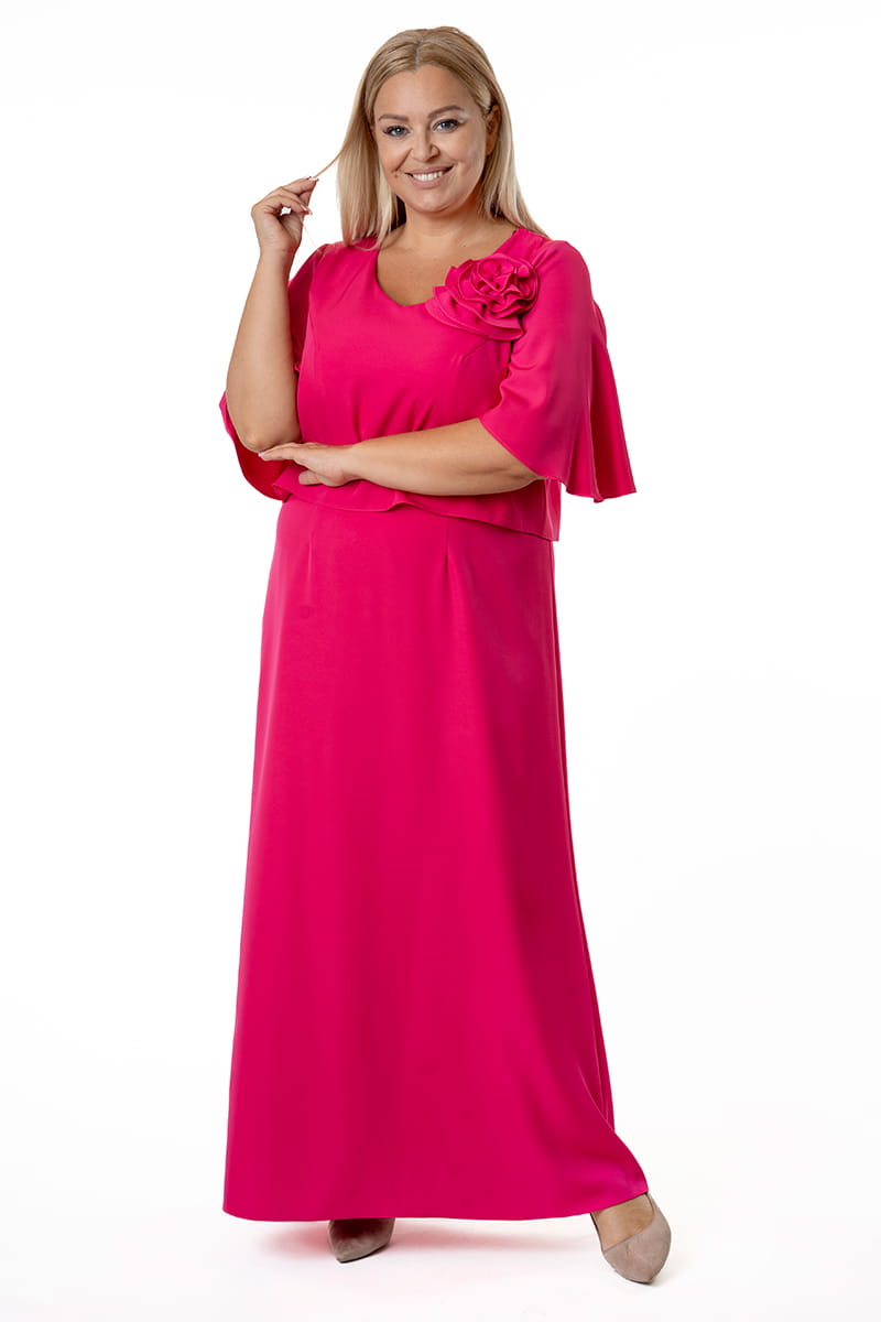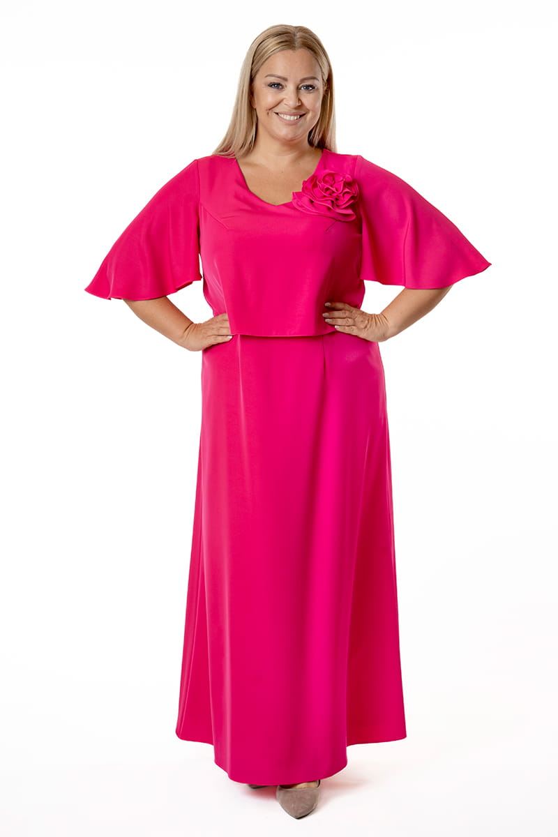 Afrodyta to model dla kobiety, która lubi czuć się wyjątkowo, ale nie przepada z błyszczącymi kreacjami. Górna warstwa w formie przypominającej bluzkę opływa sylwetkę i ukrywa wszystkie fałdki, dekolt w kształcie litery "V" optycznie wydłuża szyję, Motylowe rękawy przykrywają ramiona, a uformowany kwiat stanowi najmodniejszą ozdobę. Długa suknia zapinana jest z tyłu na zamek błyskawiczny i odszyta podszewką.