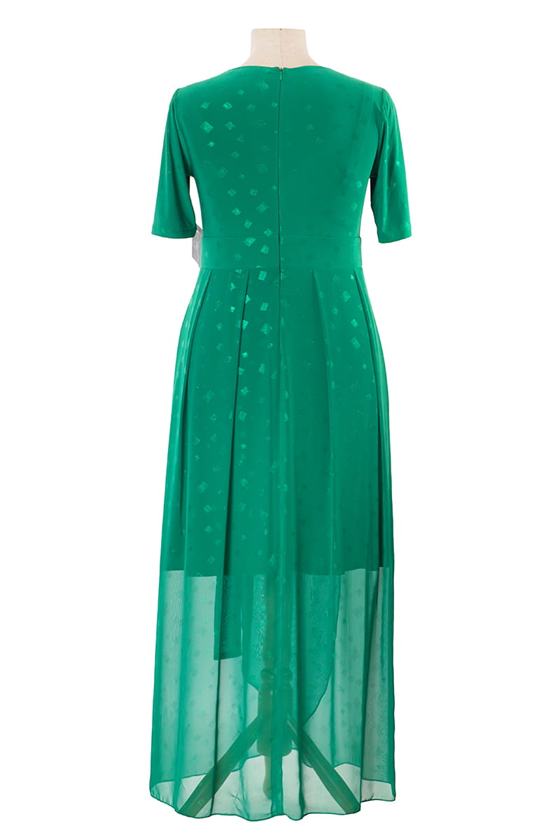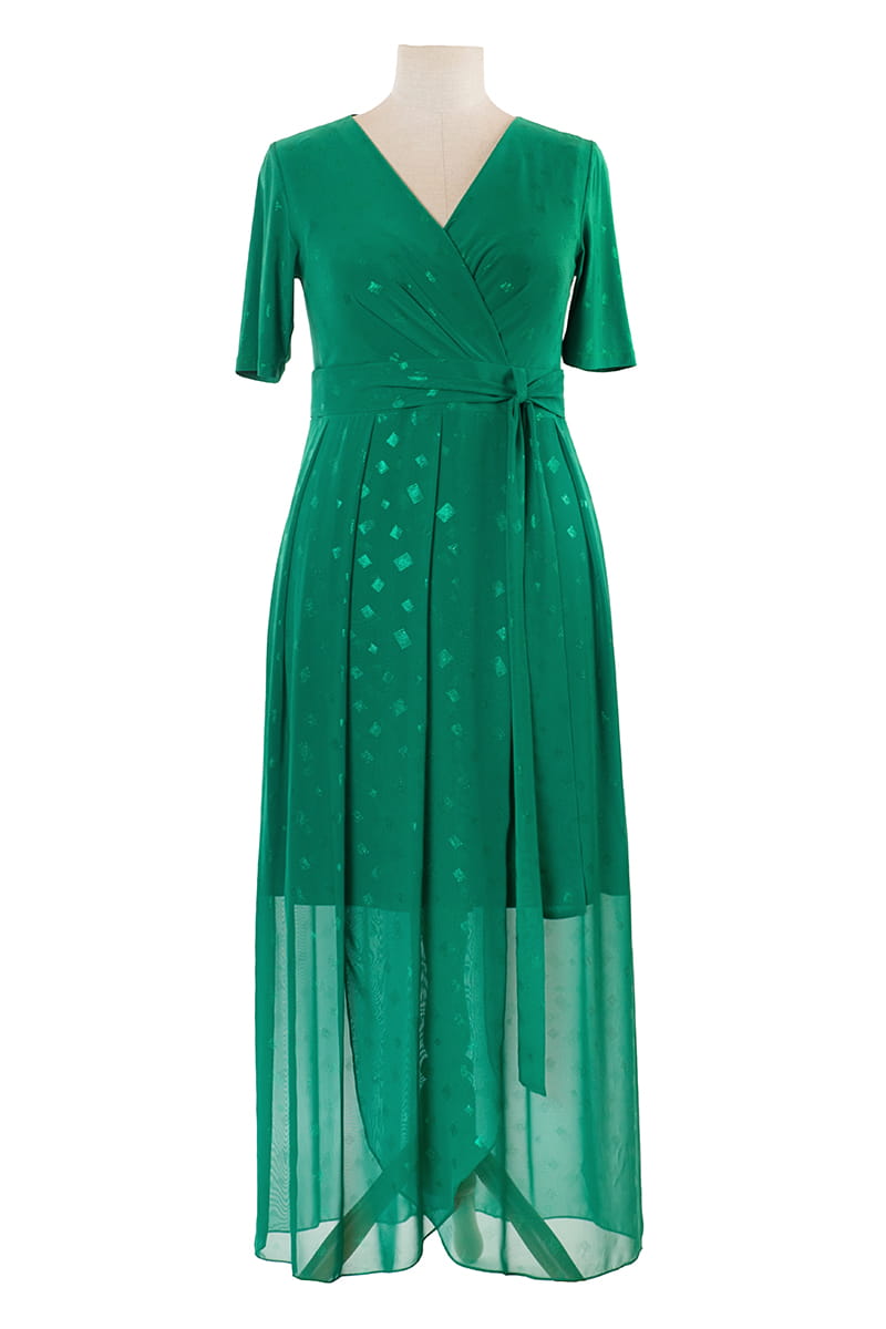 Aida w nowej odsłonie to elegancka sukienka z zakładanym dekoltem, który optycznie wysmukla szyję. Kopertowy fason i pasek w talii pięknie modelują sylwetkę podkreślając kobiece kształty. Uwagę przyciąga zastosowanie dwóch materiałów w tym samym kolorze z błyszczącym nadrukiem w romby.