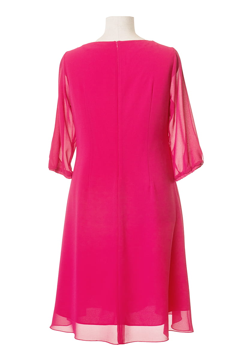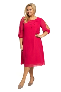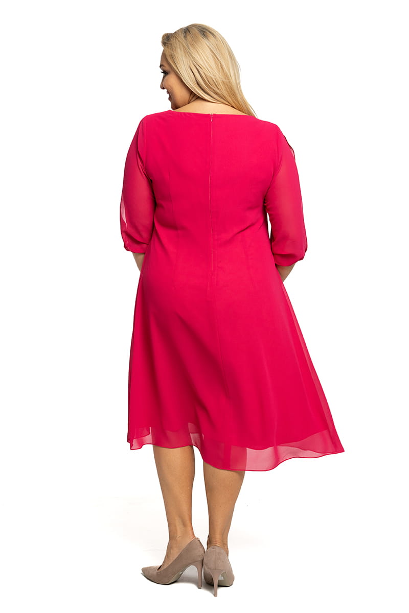 Amelia to elegancka trapezowa sukienka wykonana z szyfonu. Rękaw długości 3/4 posiada pęknięcie, dzięki któremu ukrywa niedoskonałości, ale w cieplejszy dzień nie będzie Ci gorąco. Sukienka ma zgrabny okrągły dekolt, ale jej największą i najmodniejszą ozdobą jest naszyty kwiat, który nie odstaje pod ewentualnym okryciem wierzchnim.