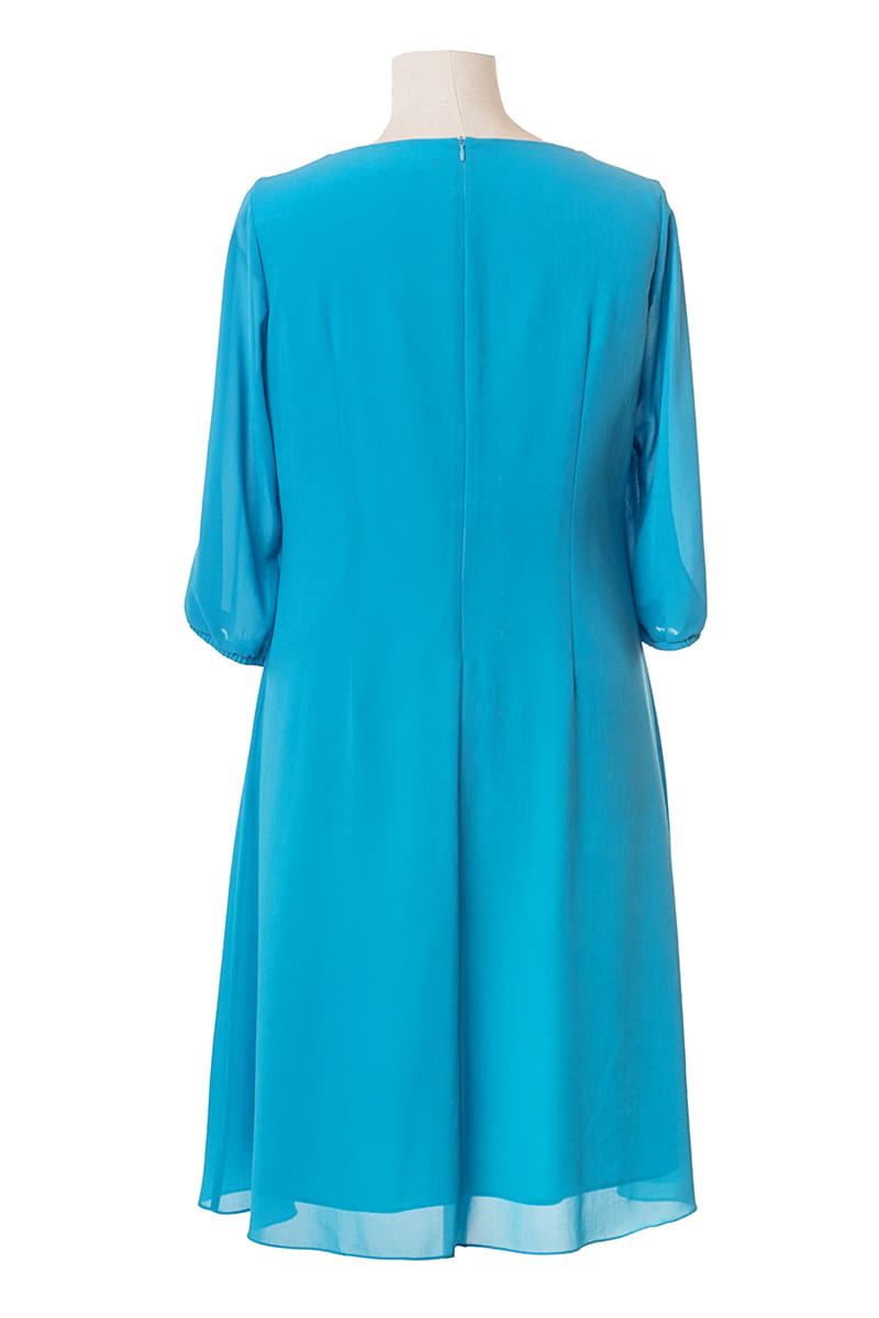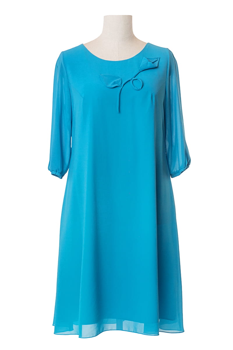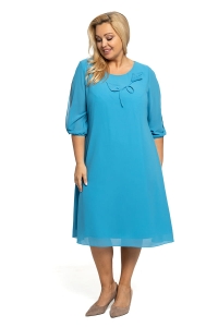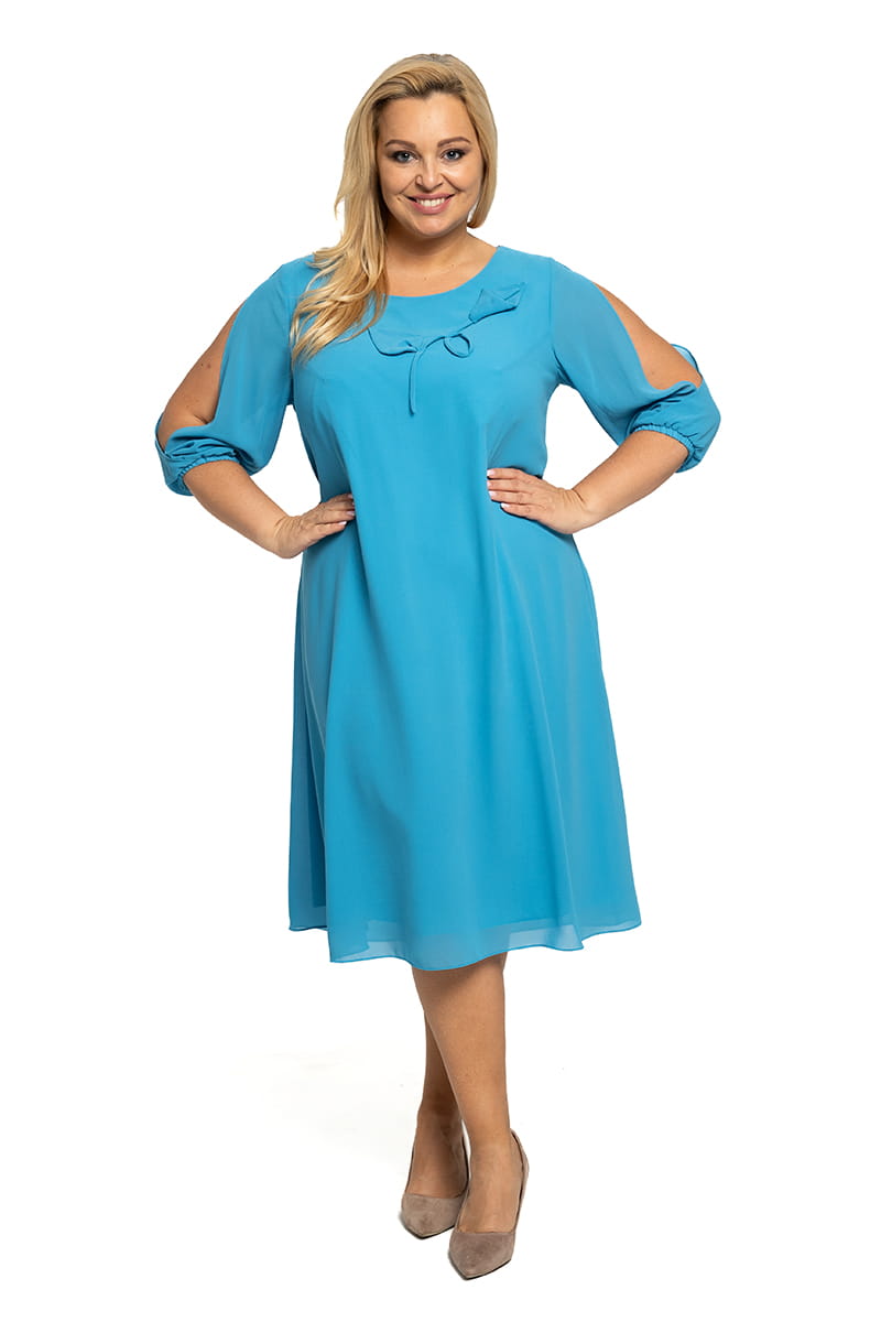 Amelia to elegancka trapezowa sukienka wykonana z szyfonu. Rękaw długości 3/4 posiada pęknięcie, dzięki któremu ukrywa niedoskonałości, ale w cieplejszy dzień nie będzie Ci gorąco. Sukienka ma zgrabny okrągły dekolt, ale jej największą i najmodniejszą ozdobą jest naszyty kwiat, który nie odstaje pod ewentualnym okryciem wierzchnim.
