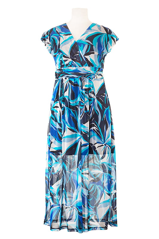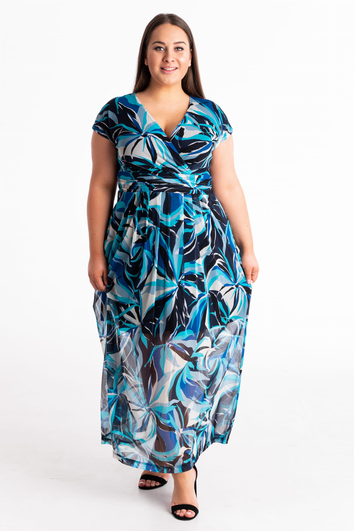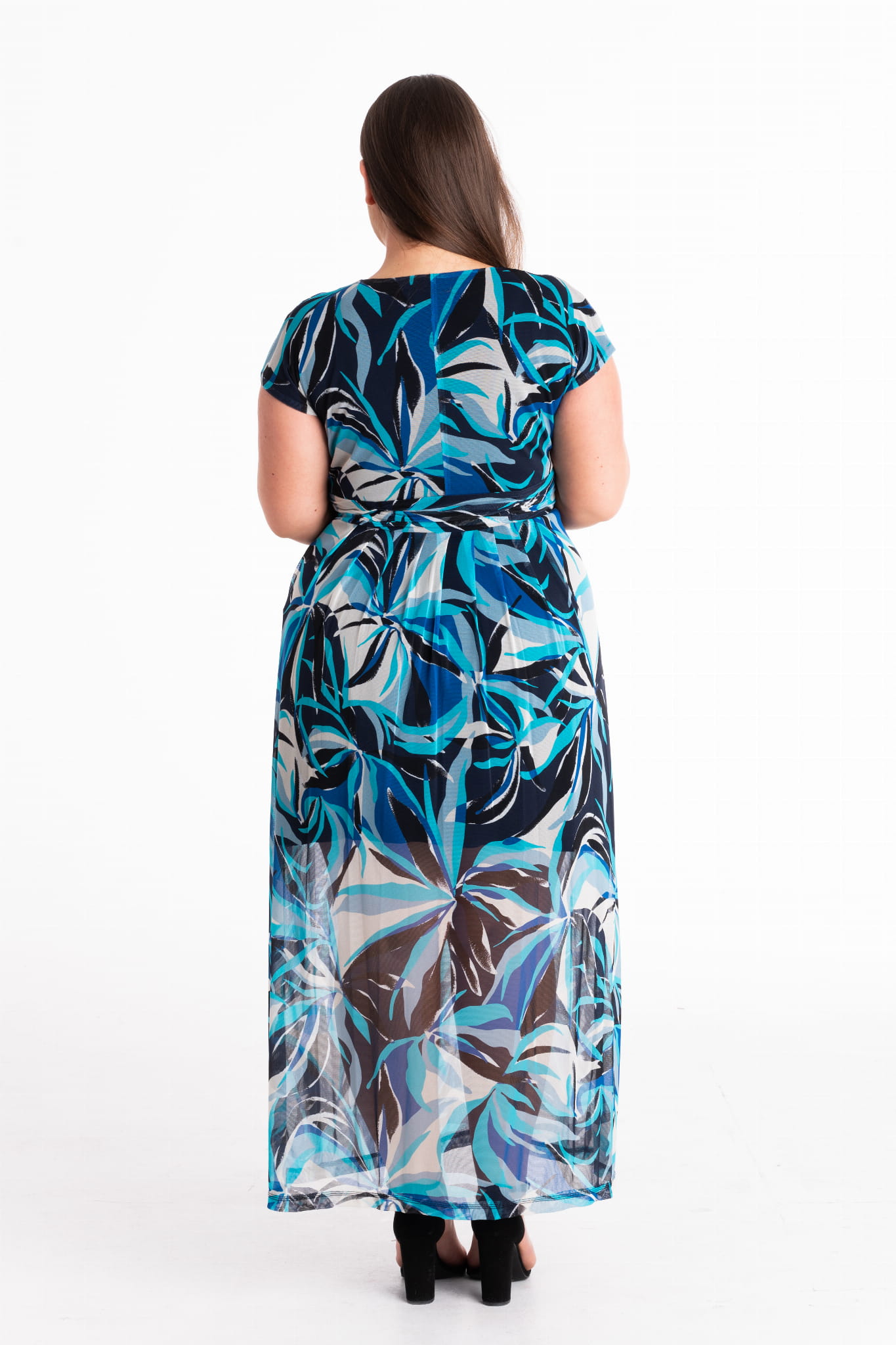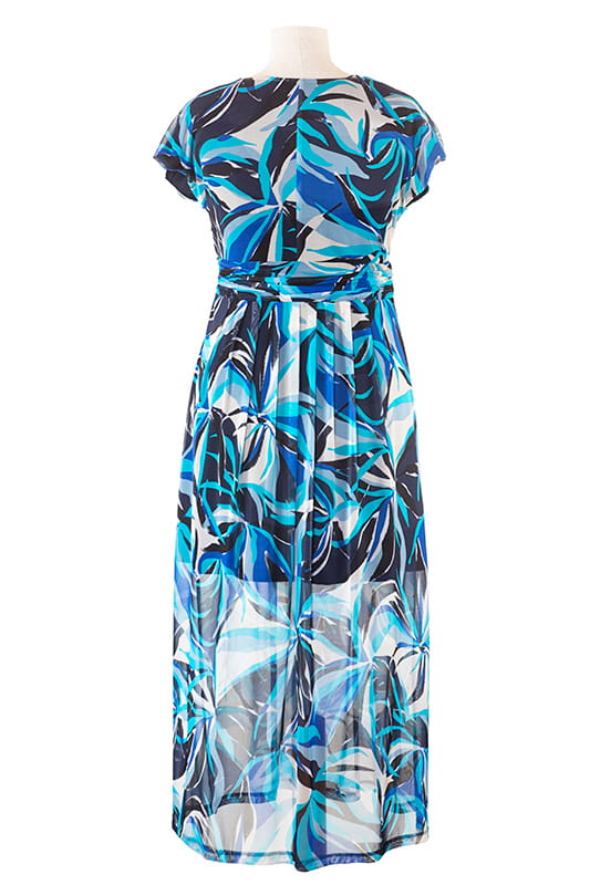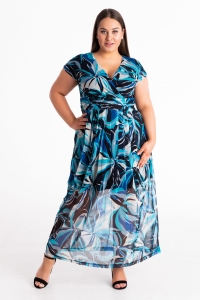 Lekka, siateczkowa sukienka. Miła w dotyku niemnąca się, wygodna w użytkowaniu. Efektowny, robiący wrażenie wielokolorowy wzór nawiązujący do modnych motywów. Dzięki swojemu długiemu krojowi znakomicie wyszczupla sylwetkę. Sukienka na podszewce, zapinana z boku na suwak.