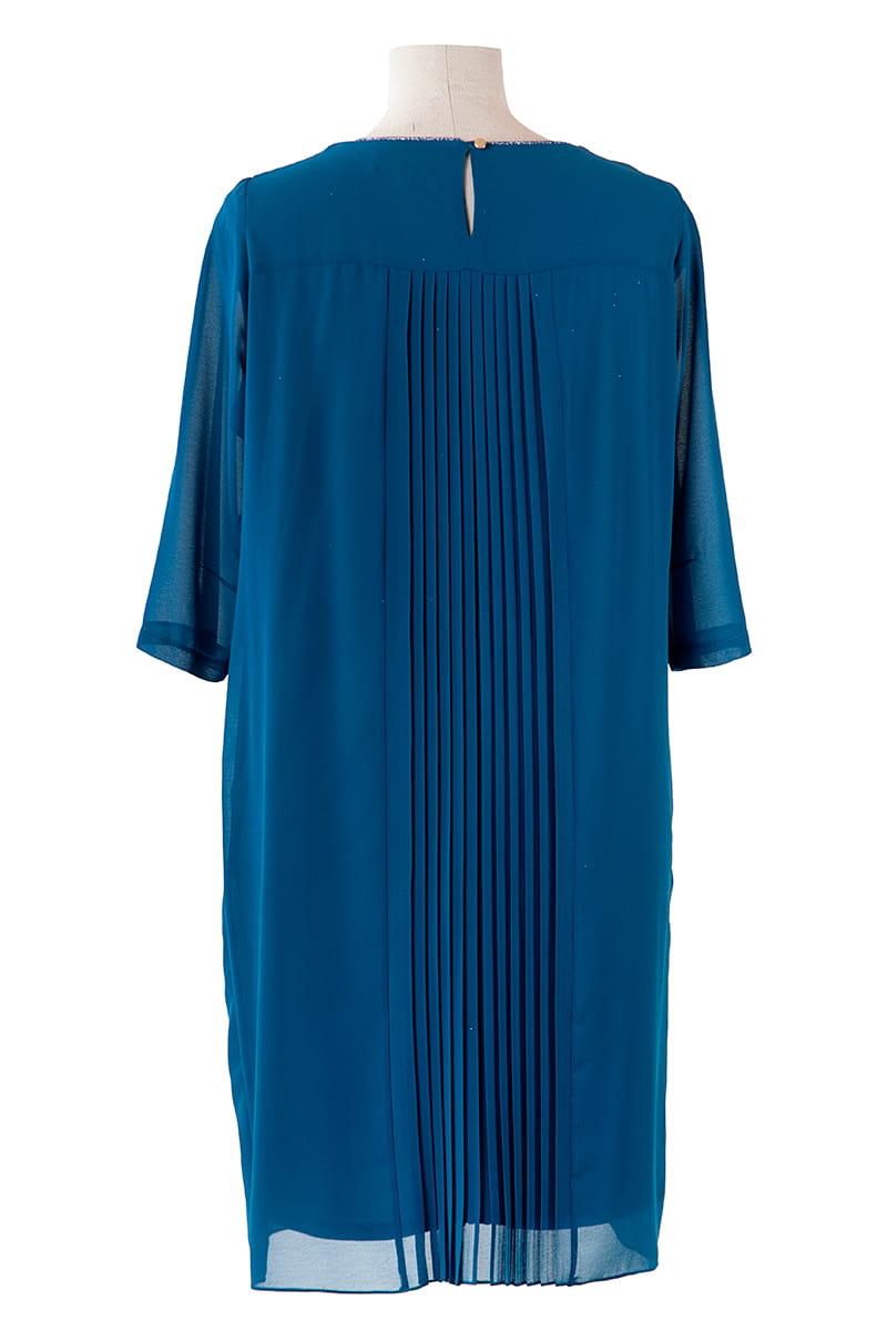 Zakupiłam ostatnio tę sukienkę i jestem bardzo zadowolona.Ma ona prześliczny kolor morski.Materiał bardzo dobrej jakości.Pod szyją wstawka z delikatnym brokatem(nie trzeba biżuterii na szyję).Już od kilku lat jestem klientką tego sklepu i zawsze byłam zadowolona.Polecam wszystkim paniom!