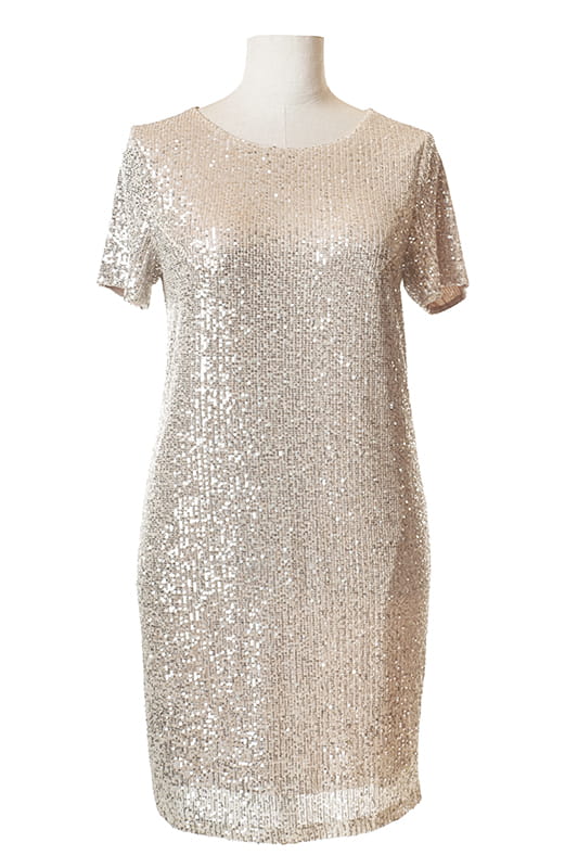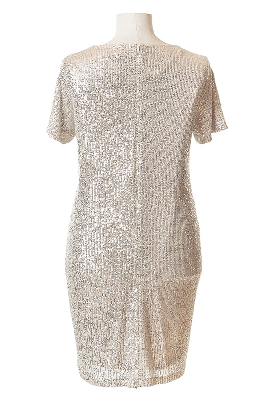 Dixi to model dla kobiet ceniących sobie klasykę i wygodę, ale z efektem WOW! Sukienka wykonana została z dzianiny pokrytej w całości rzędami cekinów, które ułożone pionowo wysmuklają sylwetkę. Dla większego komfortu sukienka jak i rękawki zostały odszyte dzianinową podszewką, z tyłu zapinana jest na zamek błyskawiczny.
