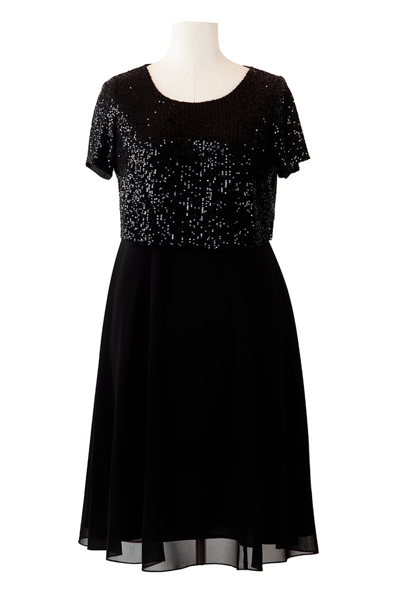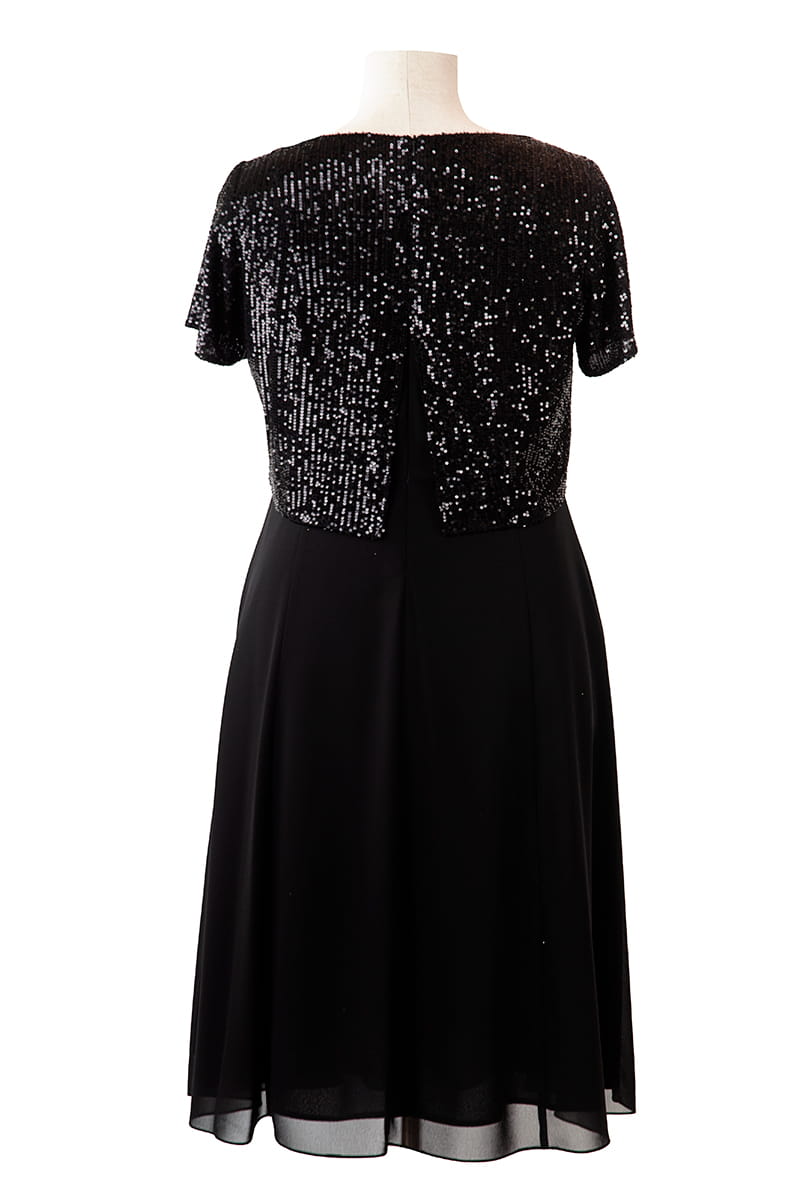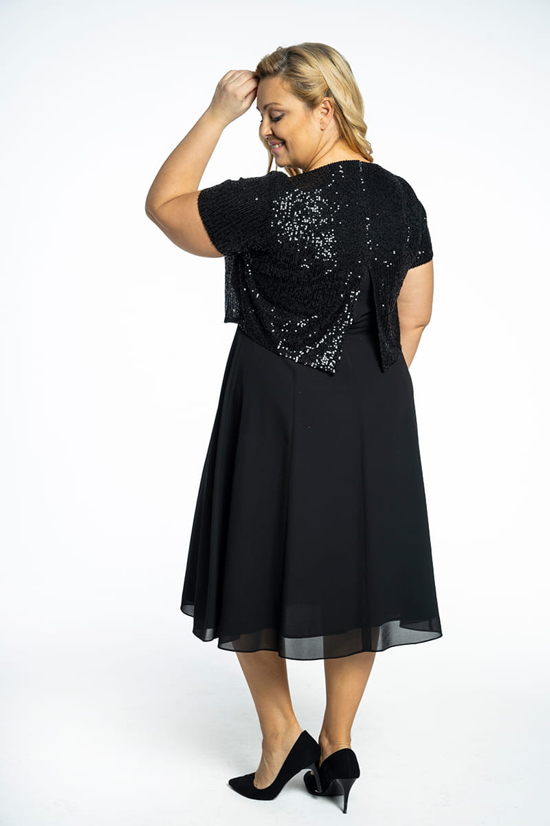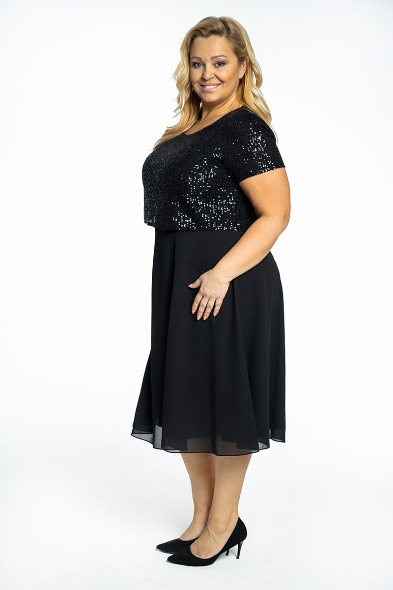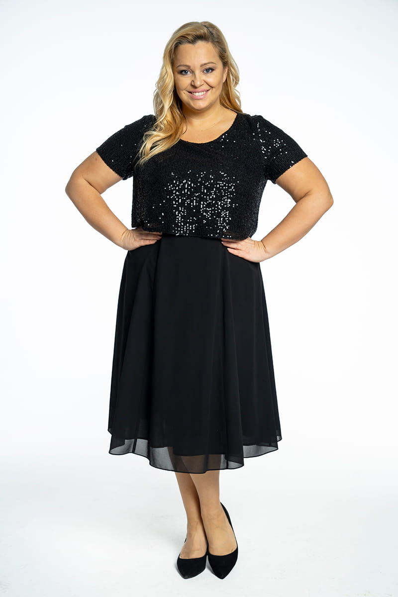 Model ELENI to propozycja na większe wyjście. Dół sukienki stanowi kloszowa spódnica w kliny, do góry zaś doszyta została luźna warstwa z połyskujących cekinów. Sukienka pięknie układa się na figurze, nie opina i nie podkreśla mankamentów sylwetki, za to pięknie ją modeluje. Z tyłu zapinana jest na zamek błyskawiczny, w całości odszyta podszewką.