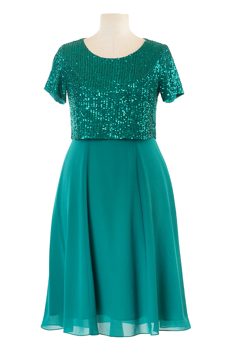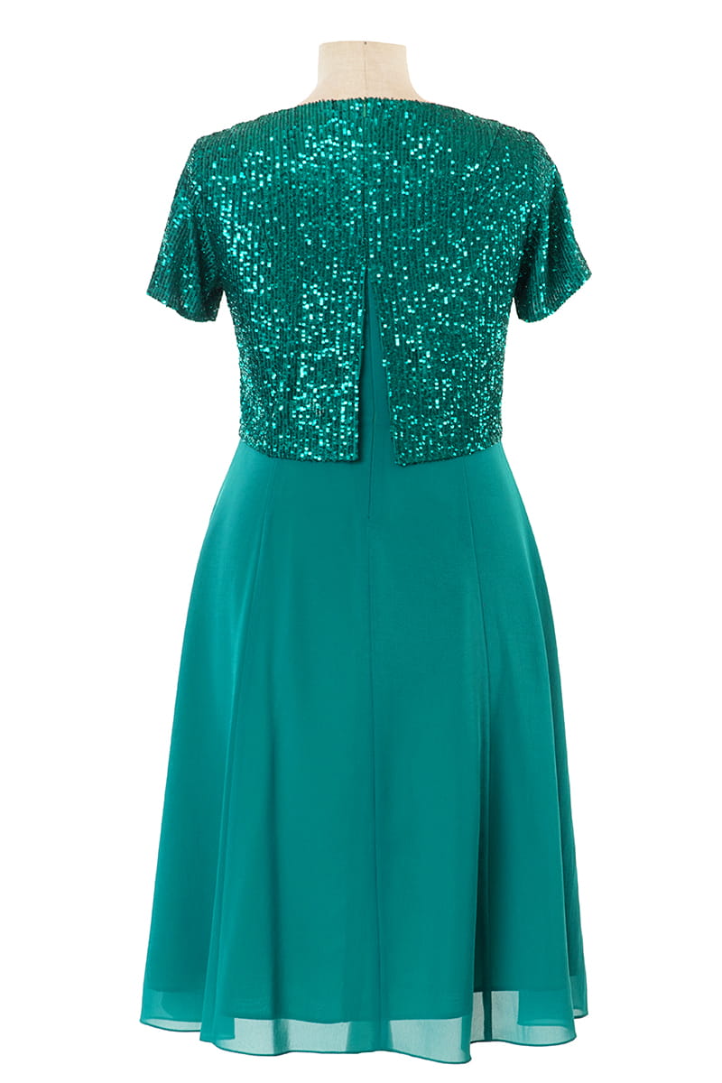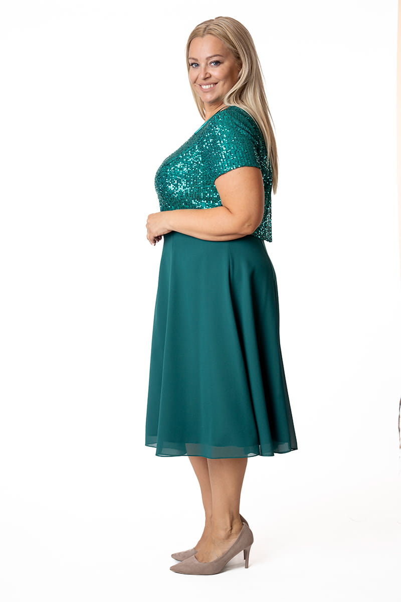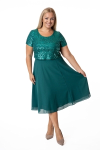 Model ELENI to propozycja na większe wyjście. Dół sukienki stanowi kloszowa spódnica w kliny, do góry zaś doszyta została luźna warstwa z połyskujących cekinów. Sukienka pięknie układa się na figurze, nie opina i nie podkreśla mankamentów sylwetki, za to pięknie ją modeluje. Z tyłu zapinana jest na zamek błyskawiczny, w całości odszyta podszewką.