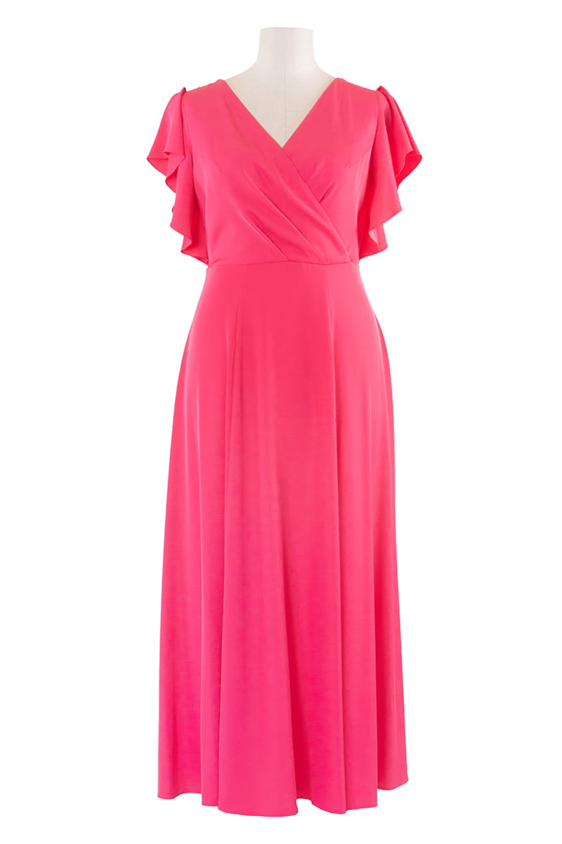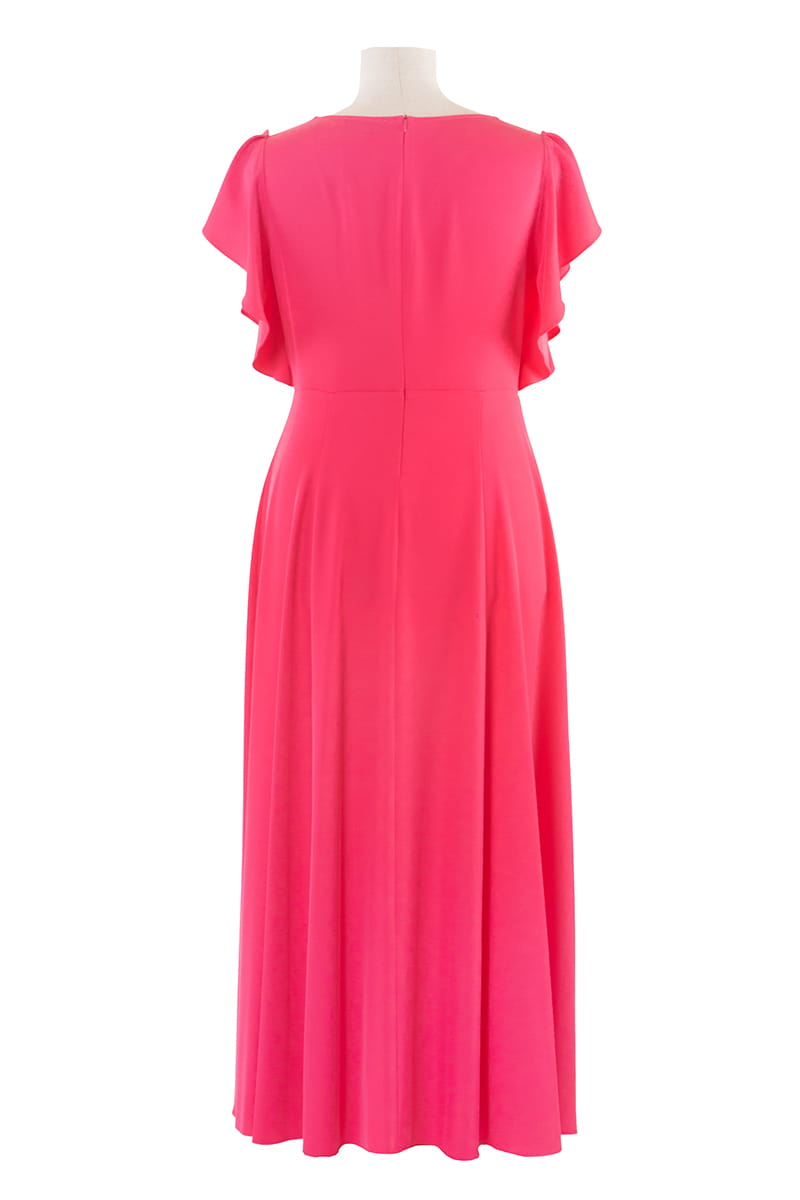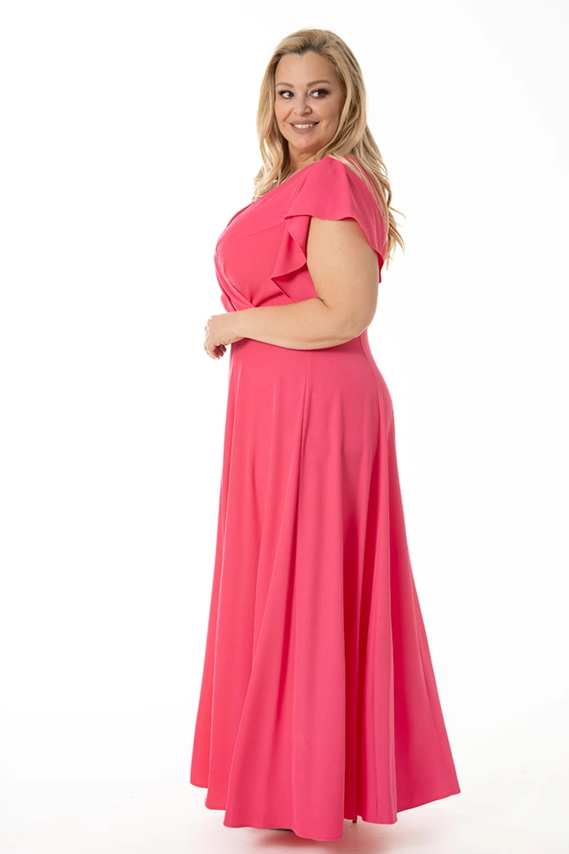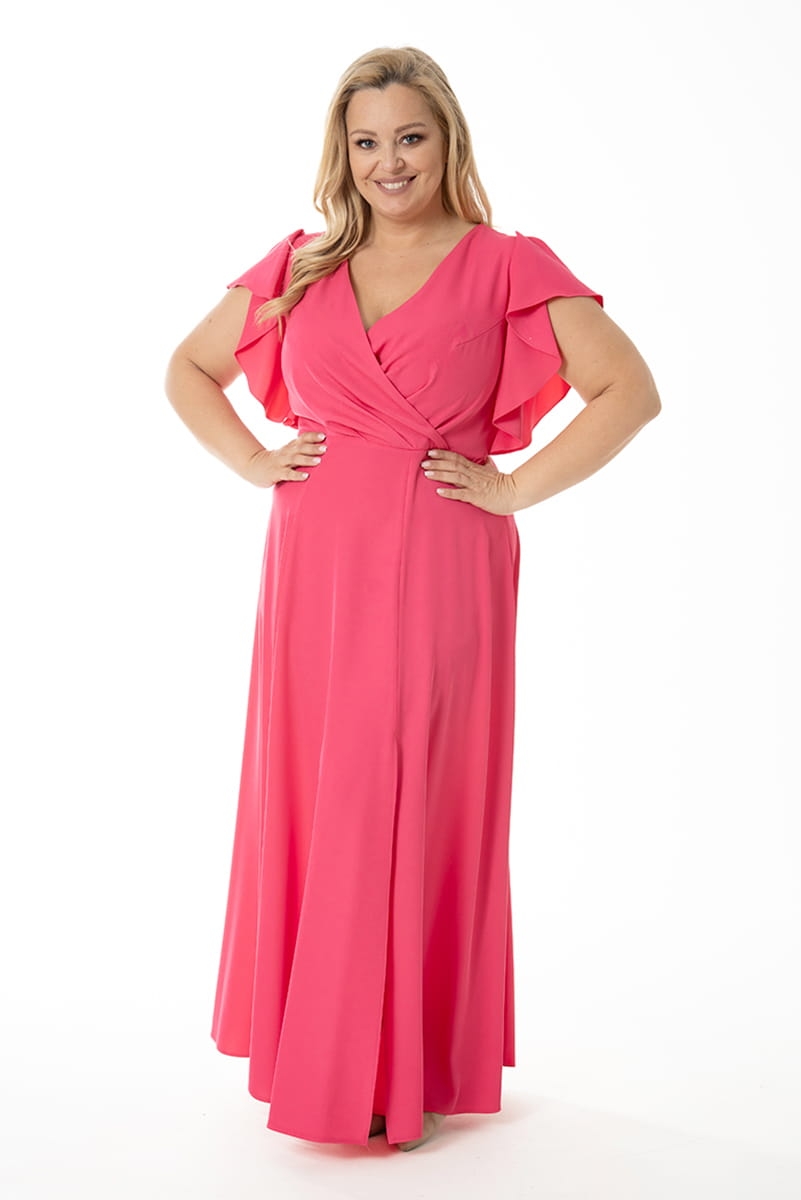 Sukienka Eliza to efektowna i wygodna zarazem kreacja na wielkie wyjście. Kopertowy dekolt wysmukla szyję i motylowe rękawy dodają lekkości. Dół sukienki stanowią rozszerzane ku dołowi kliny, na lewej nodze umieściliśmy rozporek. Sukienka zapinana jest z tyłu na zamek błyskawiczny.