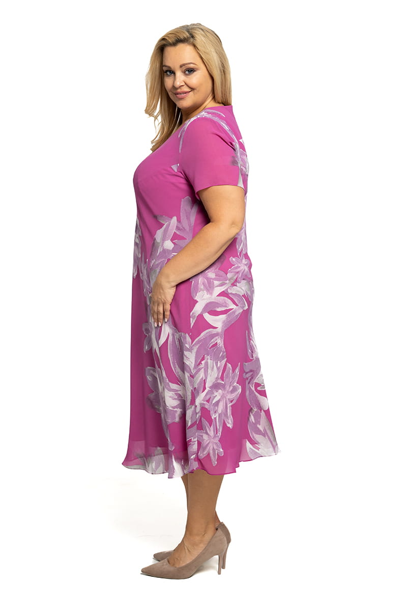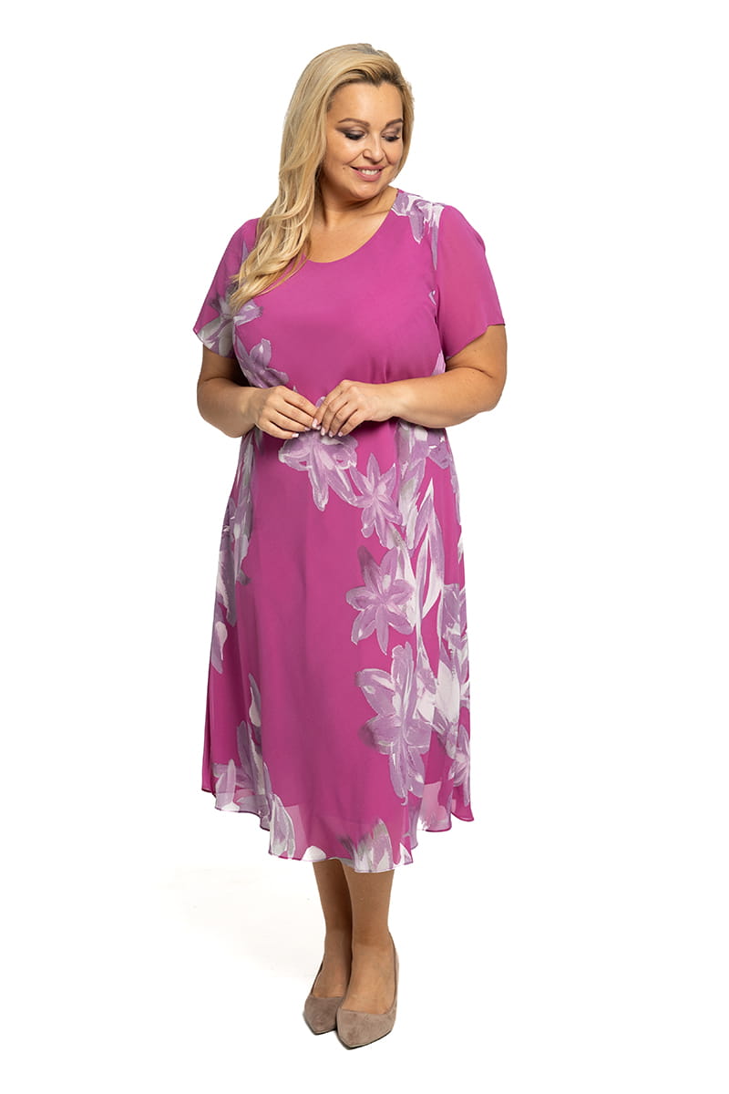Sukienka Hanna to model krojony po skosie, dzięki czemu "pracuje" i dopasowuje się do sylwetki. Długość w pół łydki, zgrabny okrągły dekolt i piękny print na tkaninie sprawiają, że ta sukienka będzie świetnym wyborem zarówno na co dzień, jak i od święta.