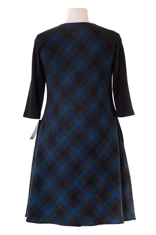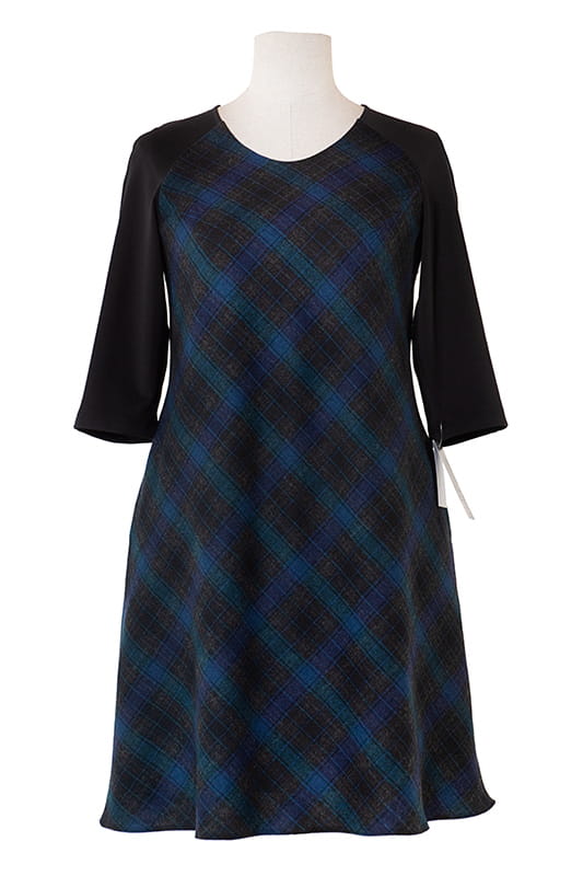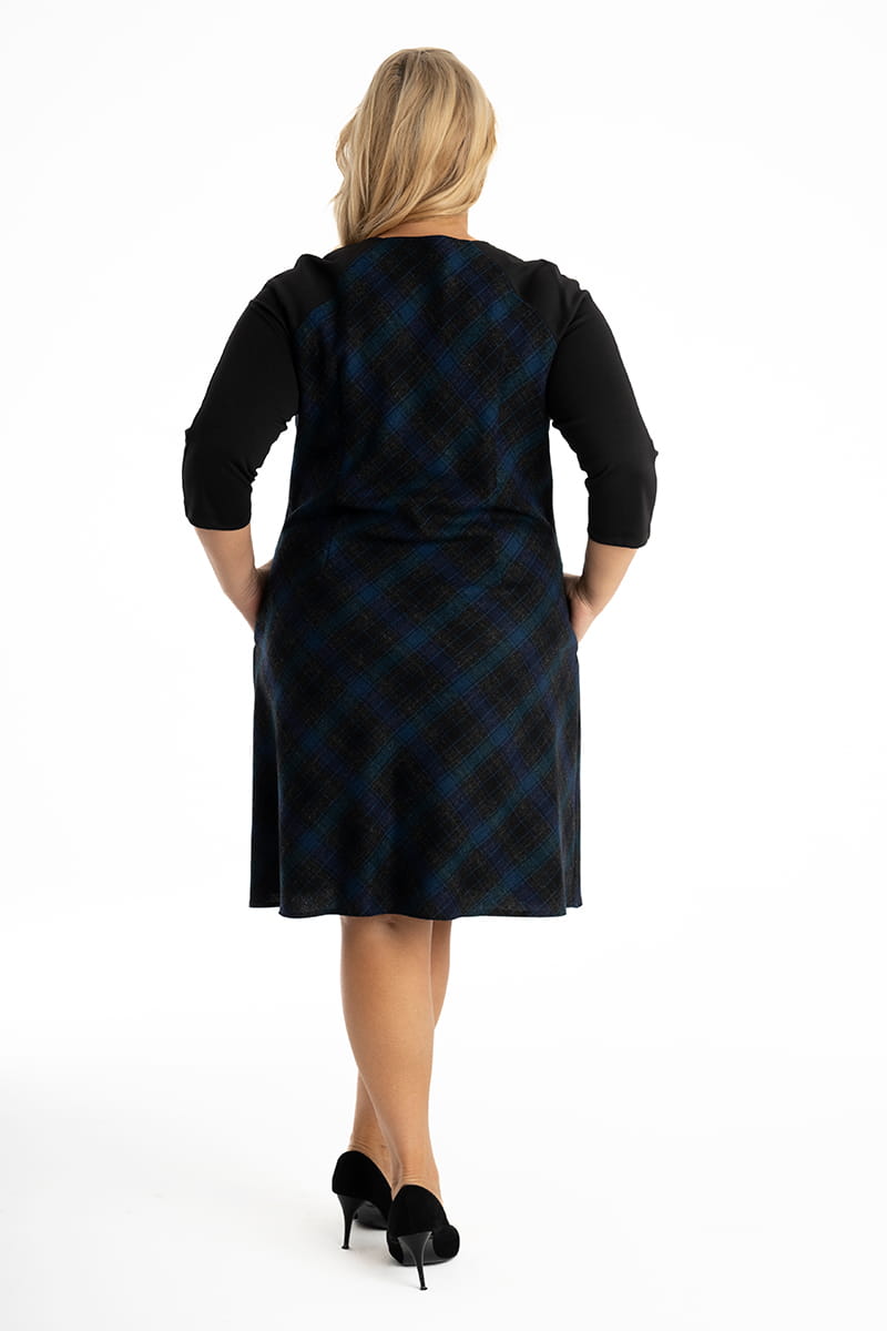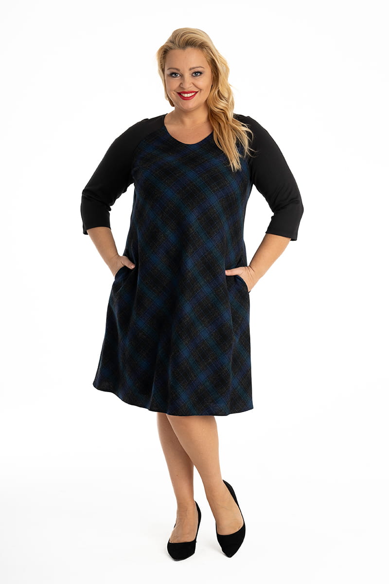 Gustowna sukienka wykrojona po skosie w kształcie litery A z kieszeniami w szwach. Ina wykonana jest z cienkiej wełny połączonej z gładką dzianiną. Okrągły dekolt, rękaw reglanowy 3/4 . Sukienka posiada podszewkę.