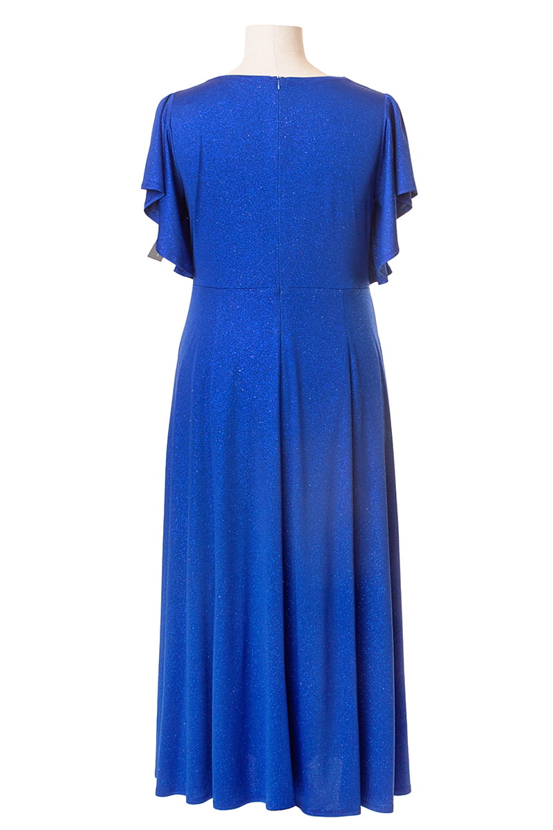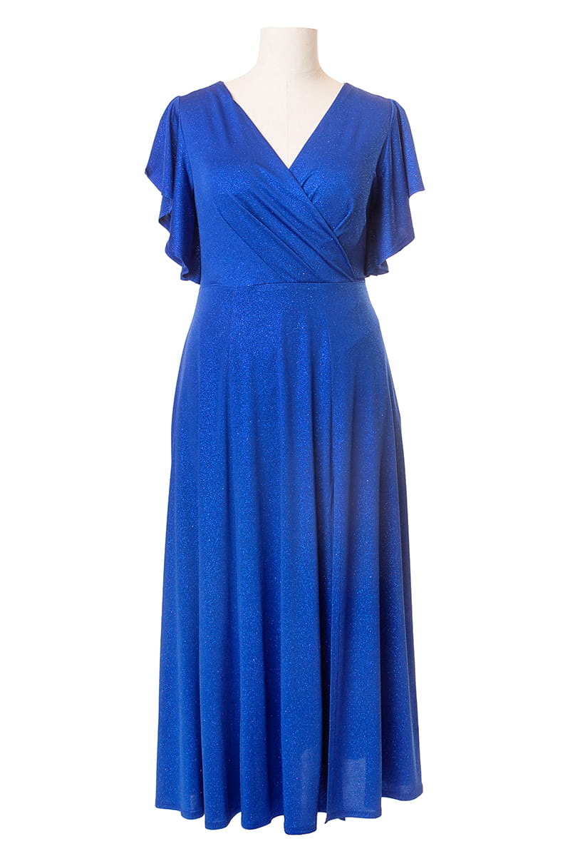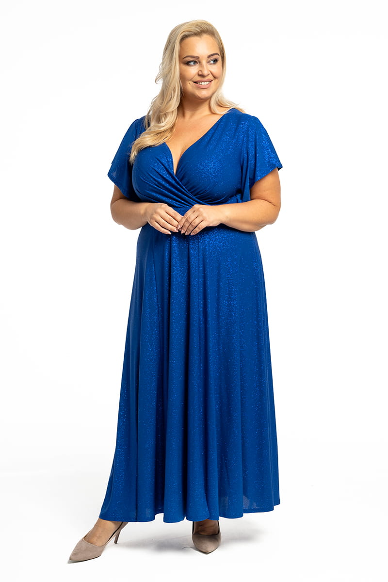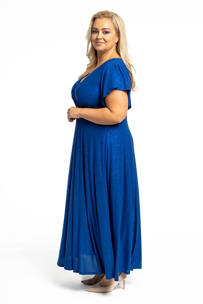 Sukienka Izabel to efektowna i wygodna zarazem kreacja na wielkie wyjście. Dopasowuje się do każdej sylwetki, ponieważ uszyliśmy ją z dzianiny pokrytej mieniącym się brokatem. Kopertowy dekolt wysmukla szyję i motylowe rękawy dodają lekkości. Dół sukienki stanowią rozszerzane ku dołowi kliny, na lewej nodze umieściliśmy rozporek. Sukienka zapinana jest z tyłu na zamek błyskawiczny, a od pasa w dodaliśmy podszewkę dla lepszego komfortu użytkowania.