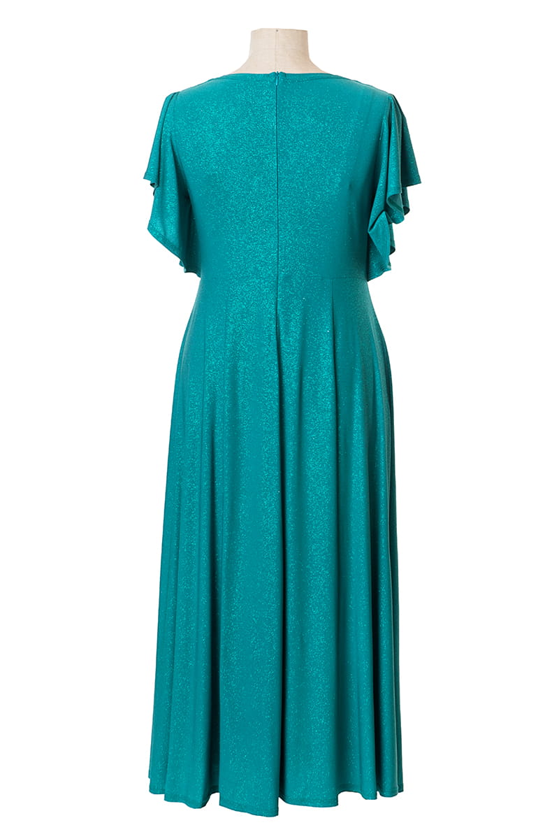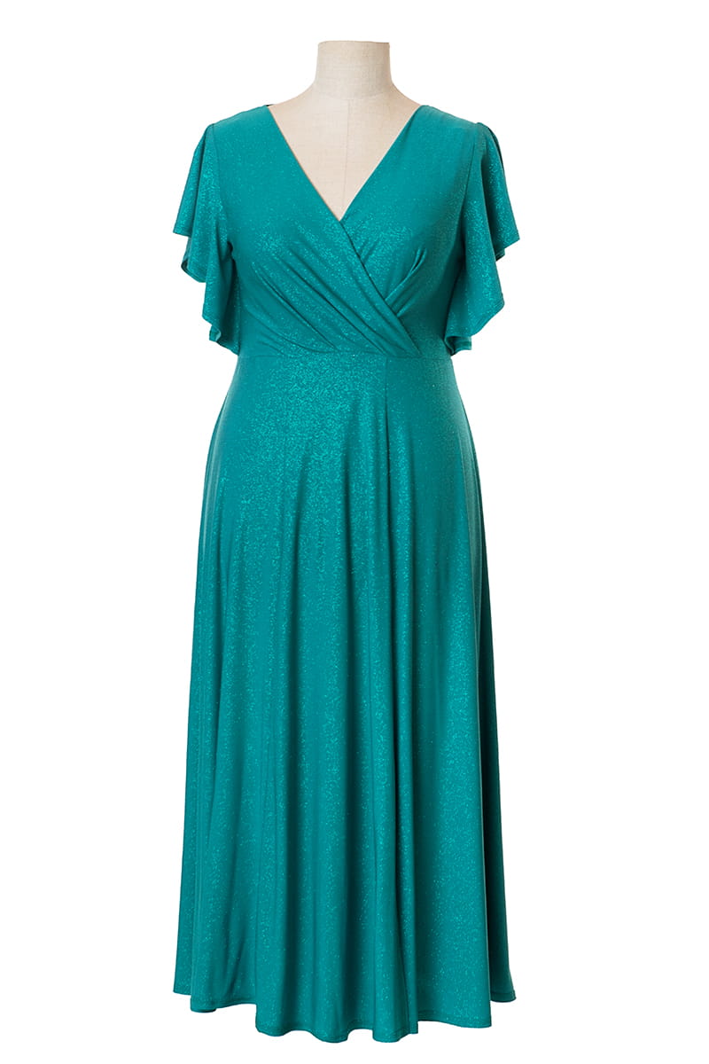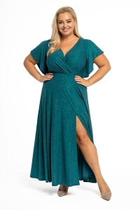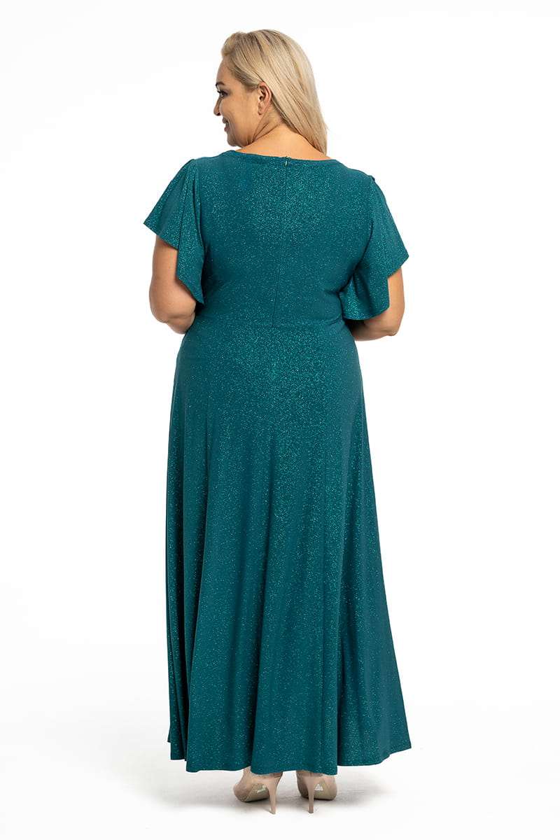 Sukienka Izabel to efektowna i wygodna zarazem kreacja na wielkie wyjście. Dopasowuje się do każdej sylwetki, ponieważ uszyliśmy ją z dzianiny pokrytej mieniącym się brokatem. Kopertowy dekolt wysmukla szyję i motylowe rękawy dodają lekkości. Dół sukienki stanowią rozszerzane ku dołowi kliny, na lewej nodze umieściliśmy rozporek. Sukienka zapinana jest z tyłu na zamek błyskawiczny, a od pasa w dodaliśmy podszewkę dla lepszego komfortu użytkowania.