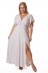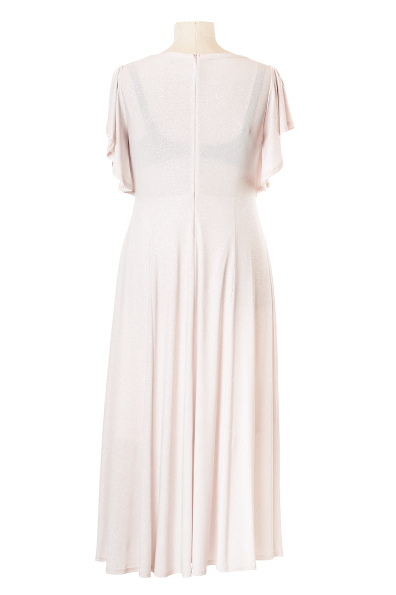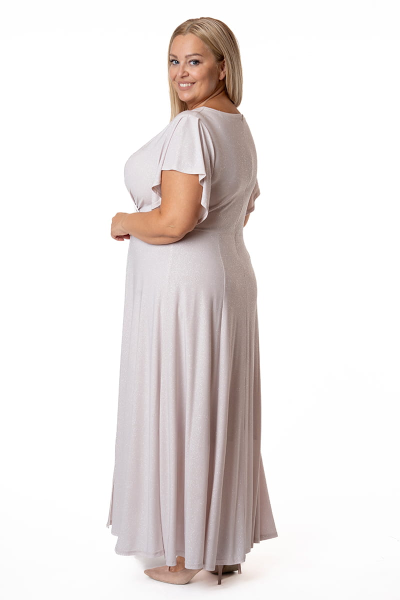 Sukienka Izabel to efektowna i wygodna zarazem kreacja na wielkie wyjście. Dopasowuje się do każdej sylwetki, ponieważ uszyliśmy ją z dzianiny pokrytej mieniącym się brokatem. Kopertowy dekolt wysmukla szyję i motylowe rękawy dodają lekkości. Dół sukienki stanowią rozszerzane ku dołowi kliny, na lewej nodze umieściliśmy rozporek. Sukienka zapinana jest z tyłu na zamek błyskawiczny, a od pasa w dodaliśmy podszewkę dla lepszego komfortu użytkowania.