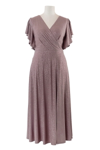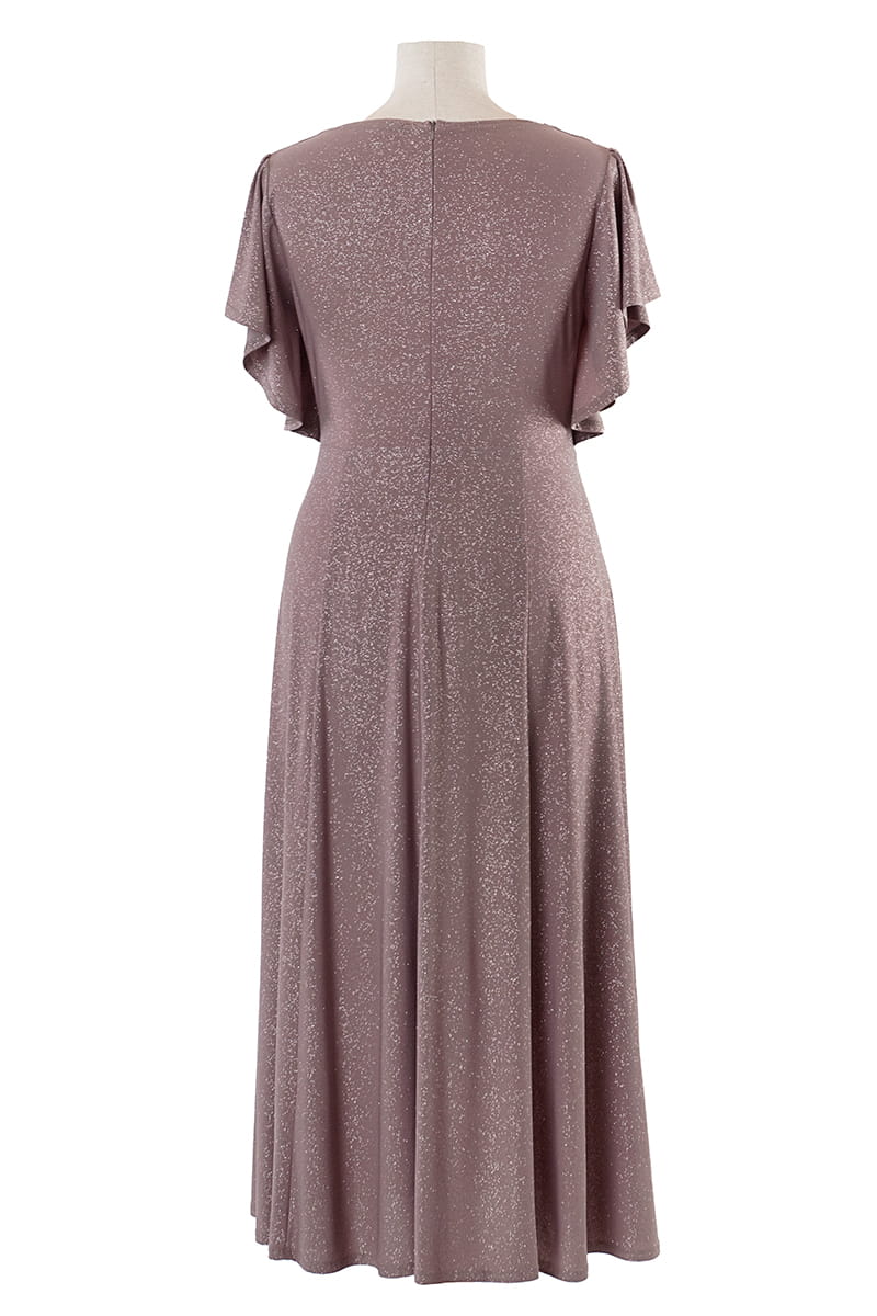 Sukienka Izabel to efektowna i wygodna zarazem kreacja na wielkie wyjście. Dopasowuje się do każdej sylwetki, ponieważ uszyliśmy ją z dzianiny pokrytej mieniącym się brokatem. Kopertowy dekolt wysmukla szyję i motylowe rękawy dodają lekkości. Dół sukienki stanowią rozszerzane ku dołowi kliny, na lewej nodze umieściliśmy rozporek. Sukienka zapinana jest z tyłu na zamek błyskawiczny, a od pasa w dodaliśmy podszewkę dla lepszego komfortu użytkowania.