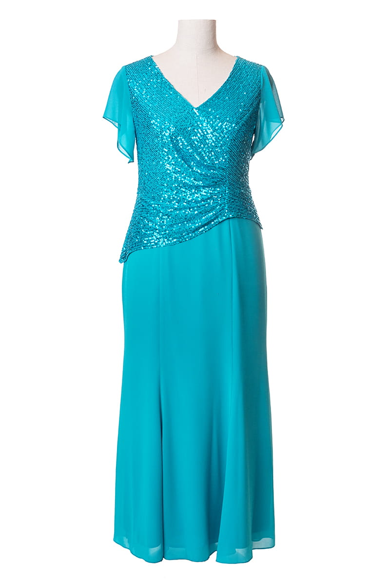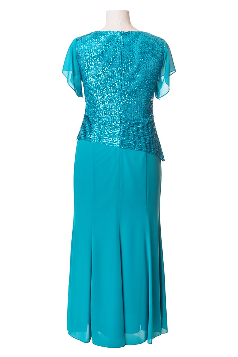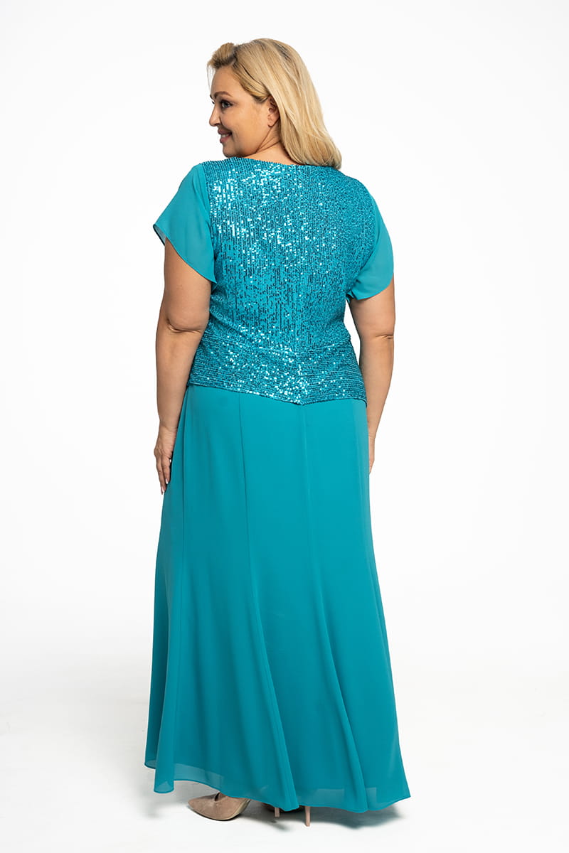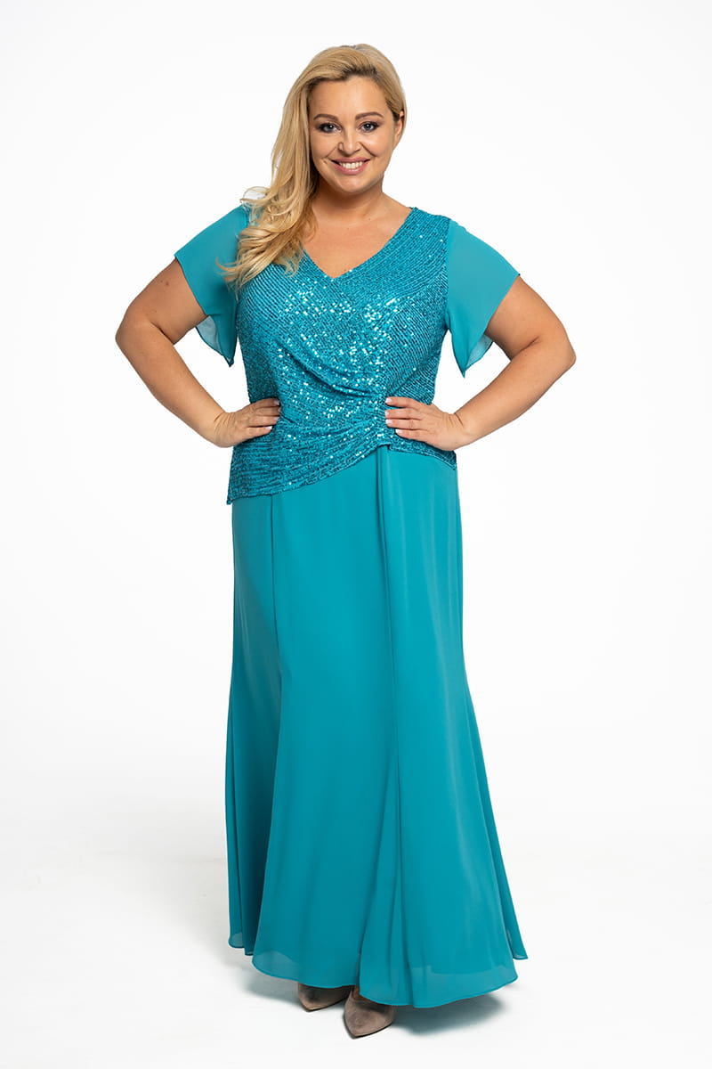 Joanna to długa suknia o kroju syreny. Jest to model, który wyszczupla i modeluje sylwetkę. Błyszcząca góra wykonana została z dzianiny, dzięki czemu nie krępuje ruchów i zmieści się w nią większy biust. Dekolt w kształcie litery V optycznie wyszczupla, a ukośne fałdy tuszują brzuszek. Rękawek w kształcie małego motyla jest swobodny nawet przy dość dużym obwodzie ramienia. Cała suknia jest dość lekka i swobodna, a jednocześnie niesamowicie elegancka.