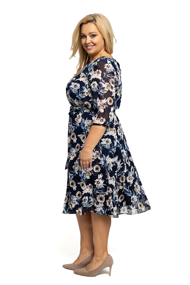 Klara to sukienka polecana szczególnie dla figur typu "gruszka". Zbluzowana góra zrównoważy cięższy dół, gumeczka w pasie dopasuje się do obwodu talii, a rozkloszowana spódnica pięknie się ułoży na biodrach. Sukienka odszyta została miękką dzianinową podszewką, dodatkiem jest pasek uszyty z tkaniny zasadniczej z klamerką w dobranym do całości kolorze.