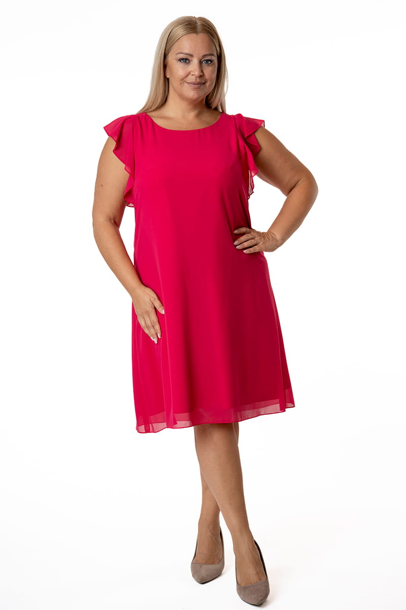 Krój w literkę "A: opływa sylwetkę wysmuklając ją, a zgrabny dekolt w połączeniu z fantastycznymi rękawkami zwęża linię barków. Sukienka zapinana jest z tyłu na zamek błyskawiczny i odszyta podszewką.
