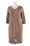 Kornelia to sukienka dla kobiet, które uwielbiają efektowne rozwiązania. Dekolt wykończony brokatową plisą w kształcie litery V . Dół wykończony ponadczasową plisowaną wstawką. Rękaw 3/4. Sukienka nie posiada podszewki.