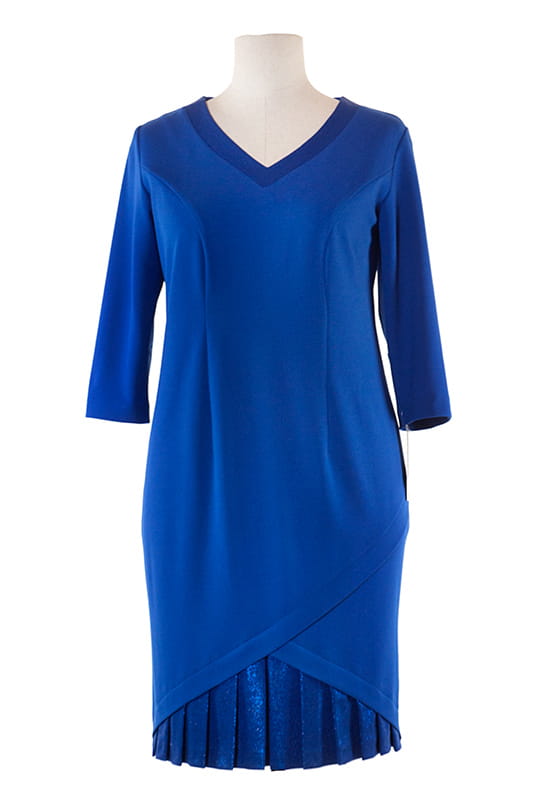 Kornelia to sukienka dla kobiet, które uwielbiają efektowne rozwiązania. Dekolt wykończony brokatową plisą w kształcie litery V . Dół wykończony ponadczasową plisowaną wstawką. Rękaw 3/4. Sukienka nie posiada podszewki.