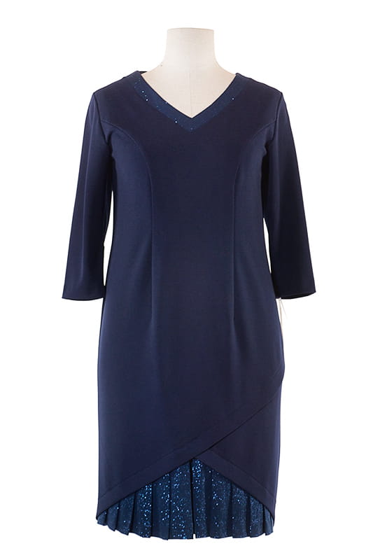 Kornelia to sukienka dla kobiet, które uwielbiają efektowne rozwiązania. Dekolt wykończony brokatową plisą w kształcie litery V . Dół wykończony ponadczasową plisowaną wstawką. Rękaw 3/4. Sukienka nie posiada podszewki.