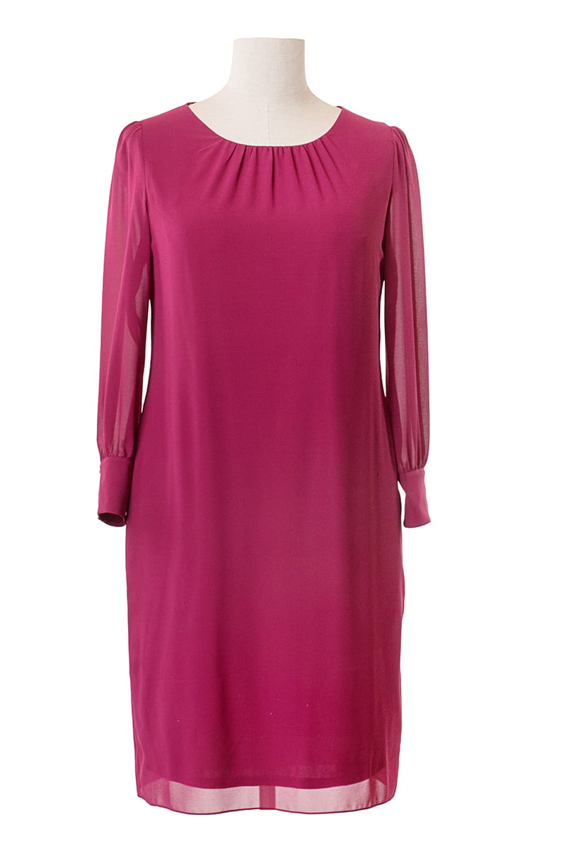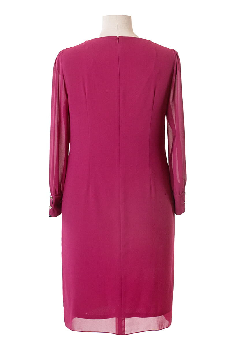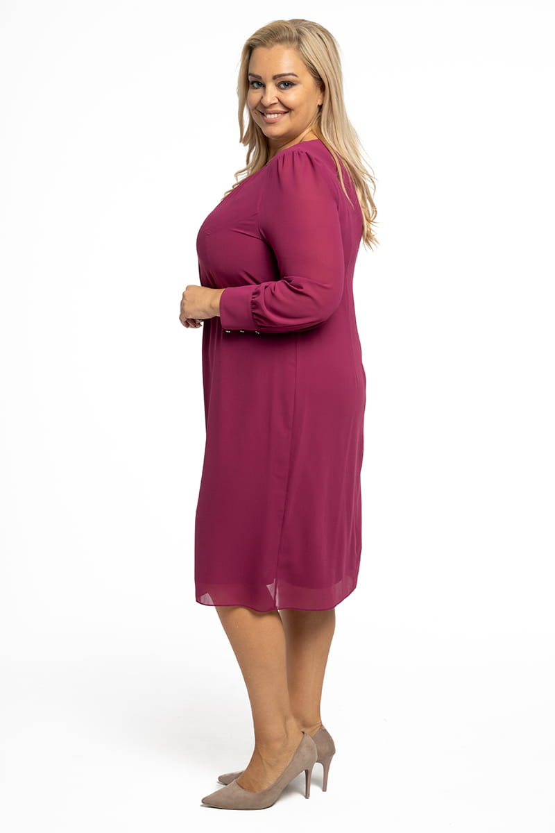 Larysa to sukienka prosta i efektowna zarazem. Zgrabny okrągły dekolt zdobi delikatne marszczenie, a prosty krój tuszuje niedoskonałości figury. Uwagę przyciągają długie rękawy zakończone efektownymi mankietami zapinanymi na srebrne guziczki. Sukienka zapinana jest z tyłu na zamek błyskawiczny i odszyta miękką dzianinową podszewką.