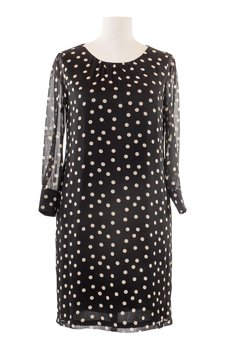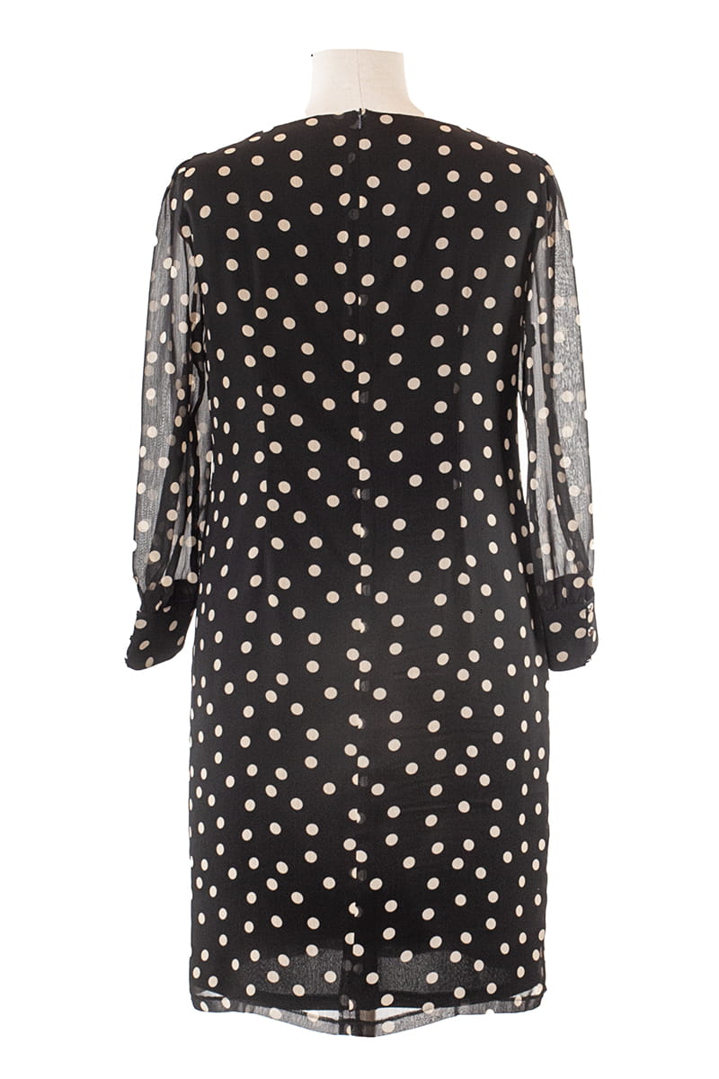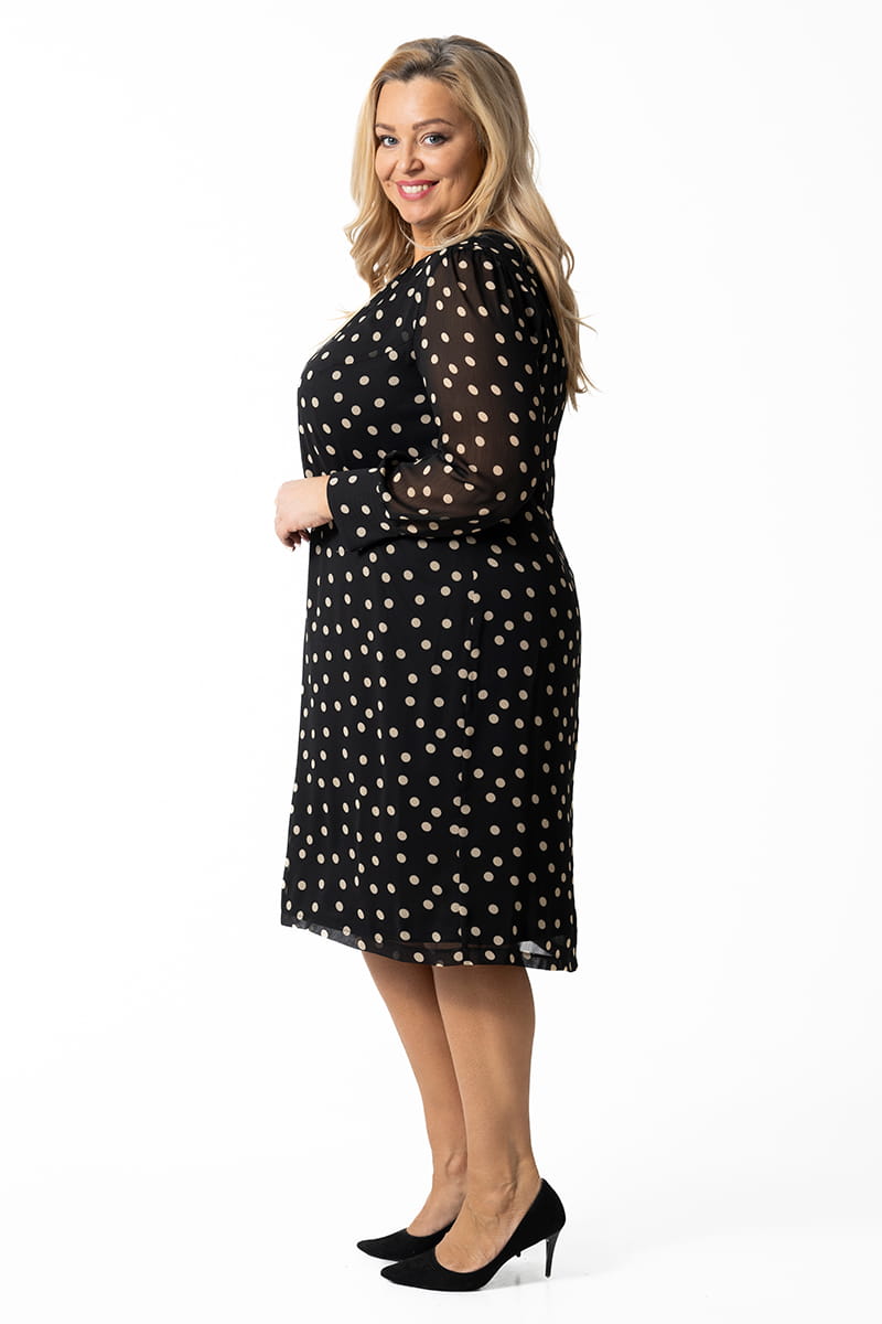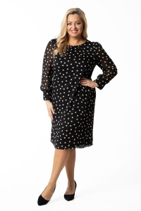 Larysa to sukienka prosta i efektowna zarazem. Zgrabny okrągły dekolt zdobi delikatne marszczenie, a prosty krój tuszuje niedoskonałości figury. Uwagę przyciągają długie rękawy zakończone efektownymi mankietami zapinanymi na srebrne guziczki. Sukienka zapinana jest z tyłu na zamek błyskawiczny i odszyta miękką dzianinową podszewką.