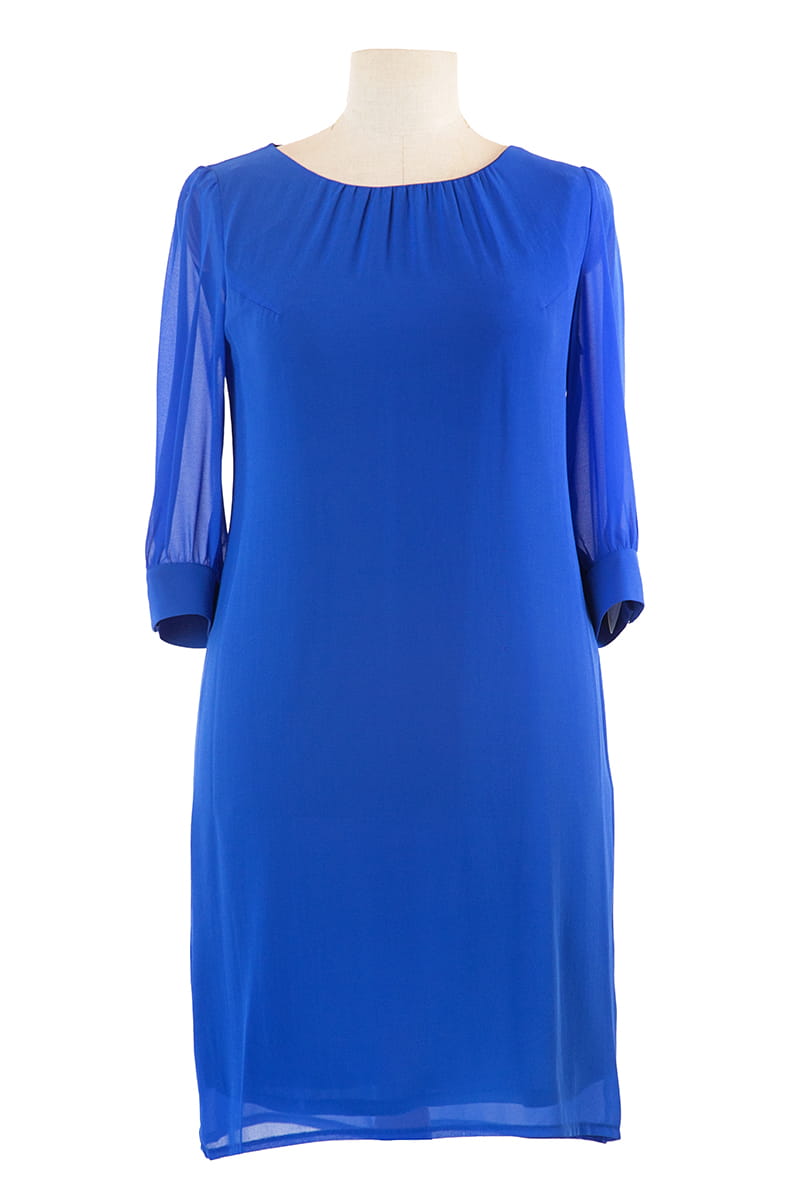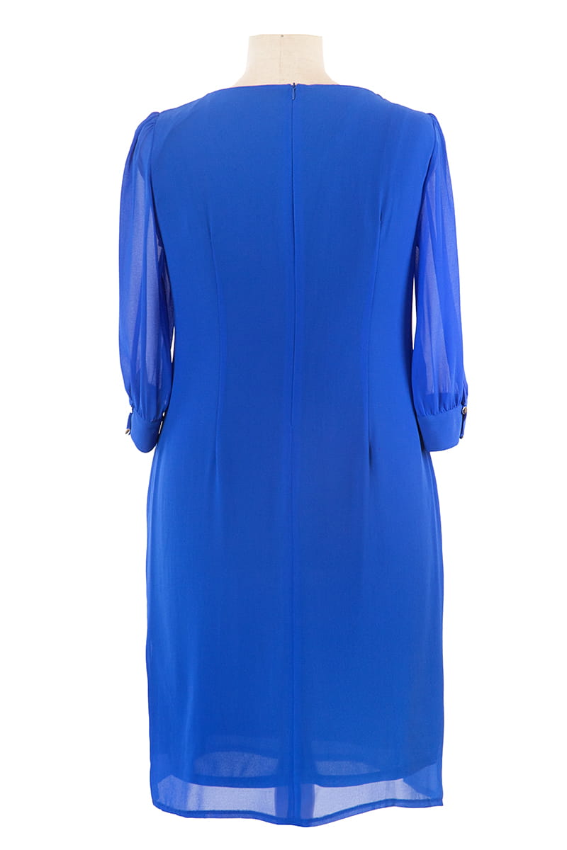 Larysa to sukienka prosta i efektowna zarazem. Zgrabny okrągły dekolt zdobi delikatne marszczenie, a prosty krój tuszuje niedoskonałości figury. Sukienka zapinana jest z tyłu na zamek błyskawiczny i odszyta miękką dzianinową podszewką.