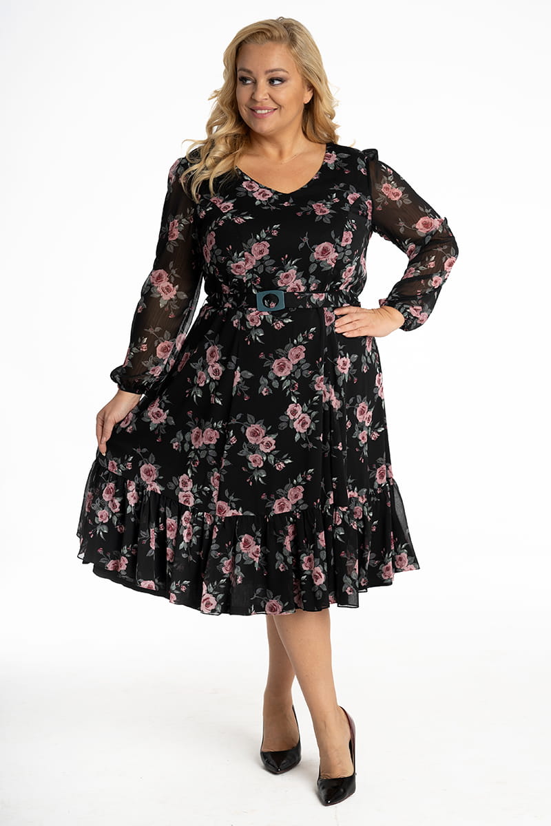 Milana to sukienka uszyta z kwiecistej tkaniny w stonowanych kolorach. Komfort noszenia zapewnia zastosowanie dzianinowej podszewki. Dekolt w kształcie litery V optycznie wysmukla szyję, pasek podkreśla talię, ale możesz z niego zrezygnować i sukienka nadal będzie wyglądała dobrze. Długi rękaw, zakończony marszczeniem i marszczona falbana na dole dodają modelowi kobiecości i romantyzmu.