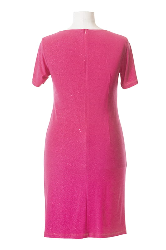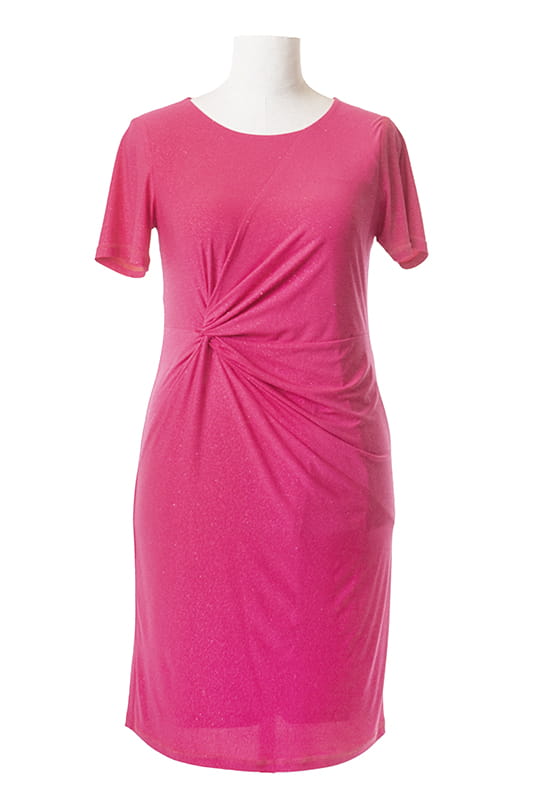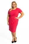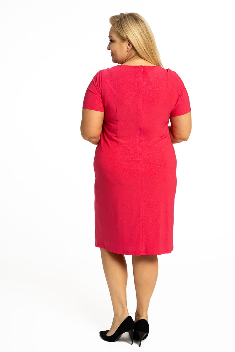 Model RAINA wykonany został z połyskującej dzianiny. Uwagę przyciąga węzeł, dzięki któremu ukryto zaszewki, a marszczenia maskują brzuszek. Sukienka odszyta została dzianinową, cienką podszewką, z tyłu zapinana jest na zamek błyskawiczny. Jest lekka i bardzo wygodna, nawet w większym rozmiarze.