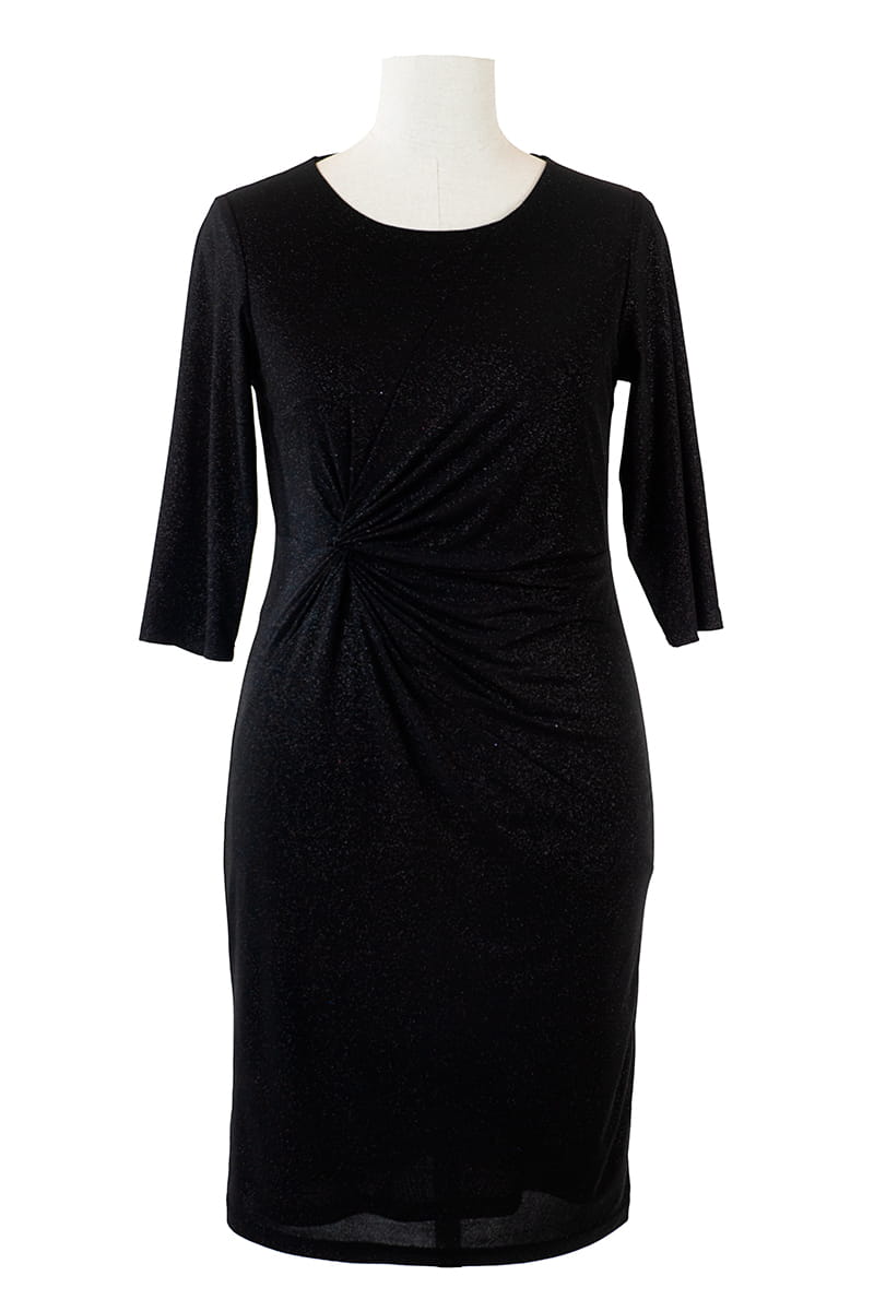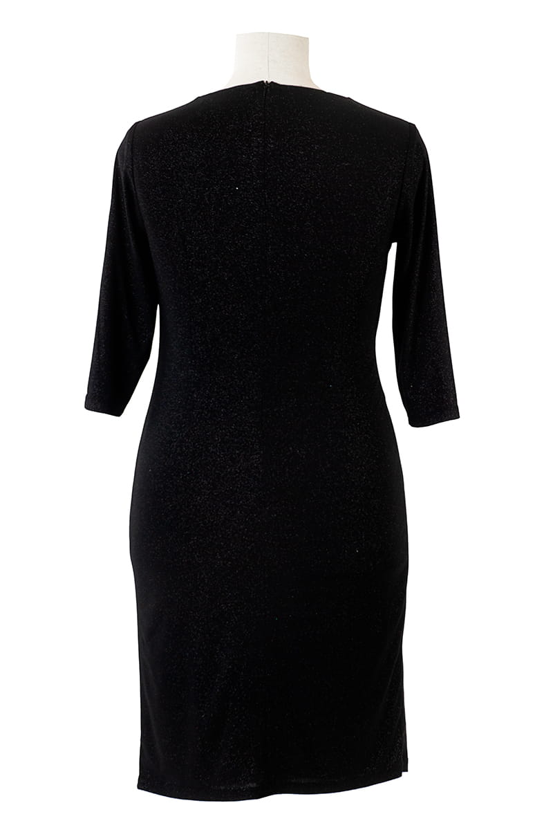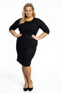 Model RAINA wykonany został z połyskującej dzianiny. Uwagę przyciąga węzeł, dzięki któremu ukryto zaszewki, a marszczenia maskują brzuszek. Sukienka odszyta została dzianinową, cienką podszewką, z tyłu zapinana jest na zamek błyskawiczny. Jest lekka i bardzo wygodna, nawet w większym rozmiarze.