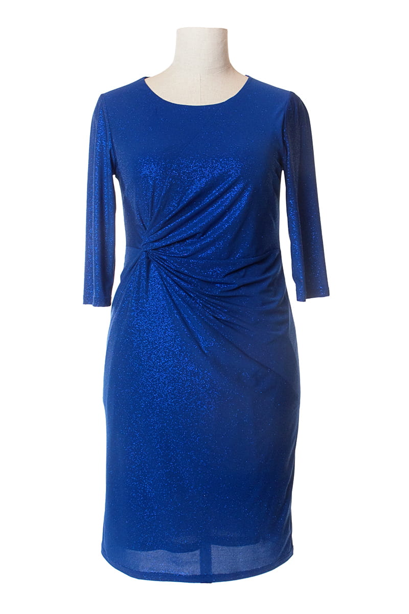 Model RAINA wykonany został z połyskującej dzianiny. Uwagę przyciąga węzeł, dzięki któremu ukryto zaszewki, a marszczenia maskują brzuszek. Sukienka odszyta została dzianinową, cienką podszewką, z tyłu zapinana jest na zamek błyskawiczny. Jest lekka i bardzo wygodna, nawet w większym rozmiarze.