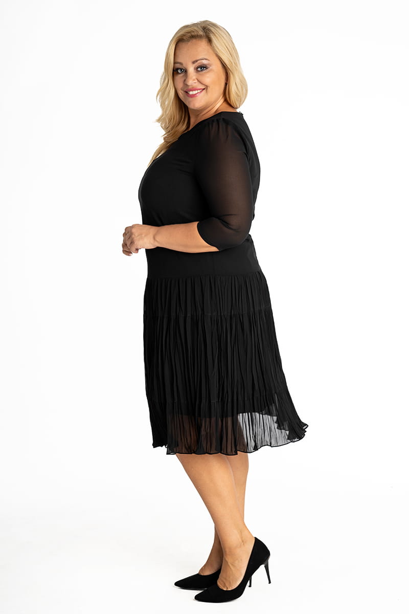 WERA to sukienka z szyfonu w całkiem nowej odsłonie. Model do tańca i do różańca, piękna, rozkloszowana, lekka i zwiewna. Dół sukienki pięknie układa się przy każdym ruchu dzięki temu, że uszyty został z marszczonych falban, a całość poddano fabrycznemu kreszowaniu.