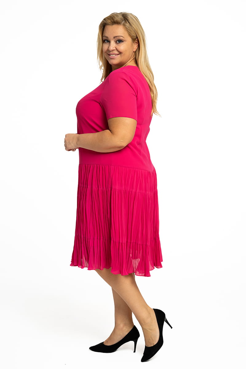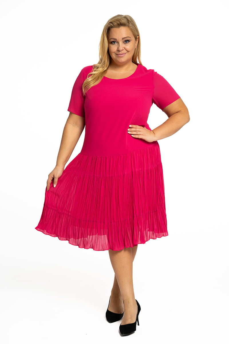 WERA to sukienka z szyfonu w całkiem nowej odsłonie. Model do tańca i do różańca, piękna, rozkloszowana, lekka i zwiewna. Dół sukienki pięknie układa się przy każdym ruchu dzięki temu, że uszyty został z marszczonych falban, a całość poddano fabrycznemu kreszowaniu.
