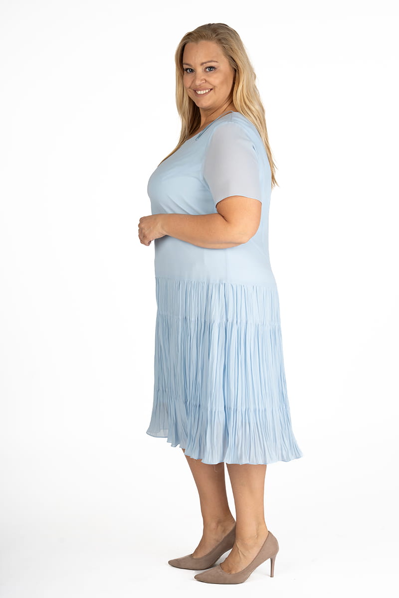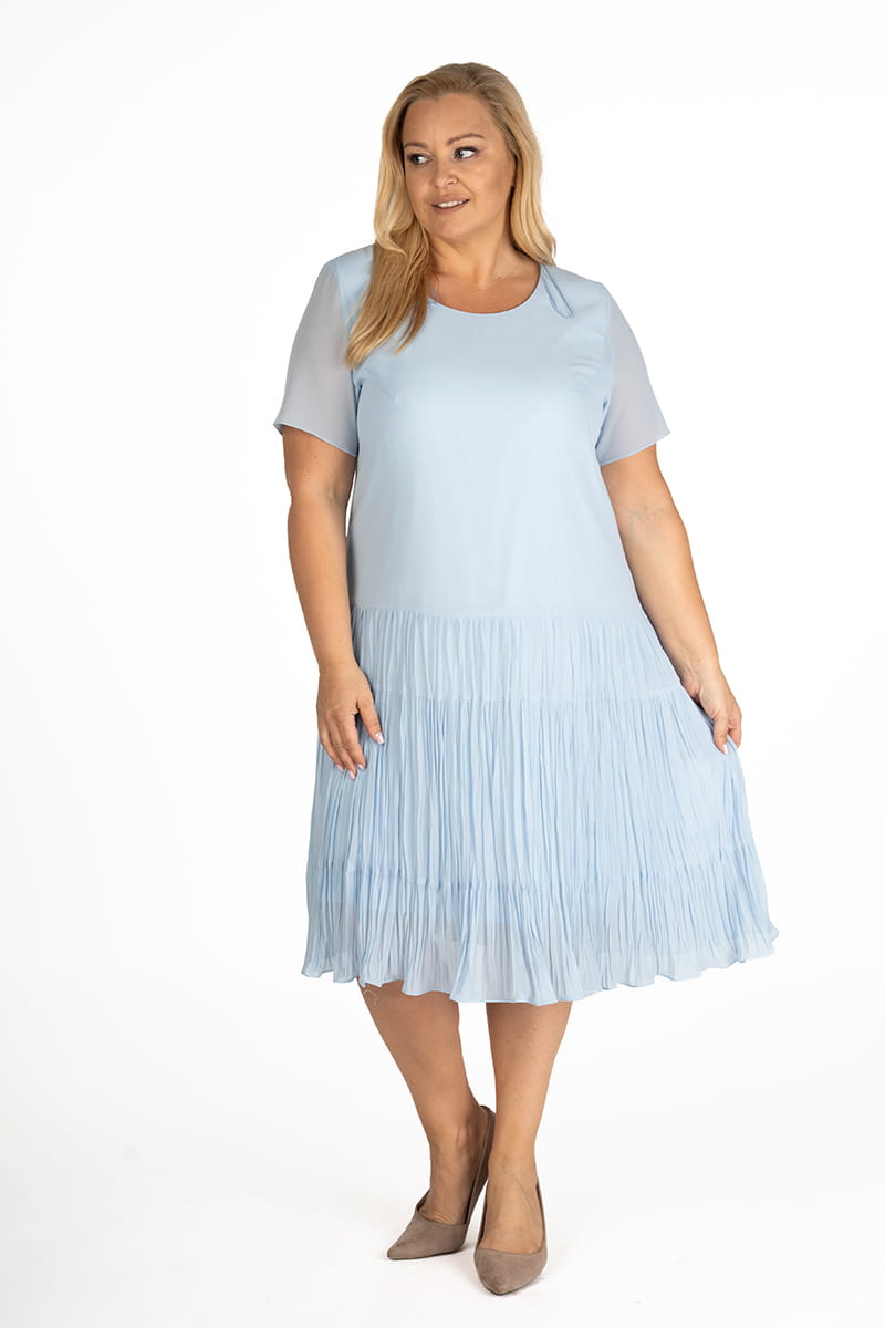 WERA to sukienka z szyfonu w całkiem nowej odsłonie. Model do tańca i do różańca, piękna, rozkloszowana, lekka i zwiewna. Dół sukienki pięknie układa się przy każdym ruchu dzięki temu, że uszyty został z marszczonych falban, a całość poddano fabrycznemu kreszowaniu.