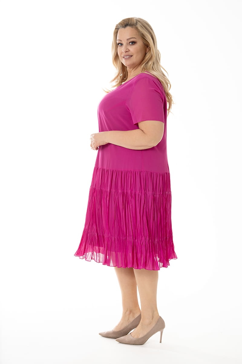 WERA to sukienka z szyfonu w całkiem nowej odsłonie. Model do tańca i do różańca, piękna, rozkloszowana, lekka i zwiewna. Dół sukienki pięknie układa się przy każdym ruchu dzięki temu, że uszyty został z marszczonych falban, a całość poddano fabrycznemu kreszowaniu.
