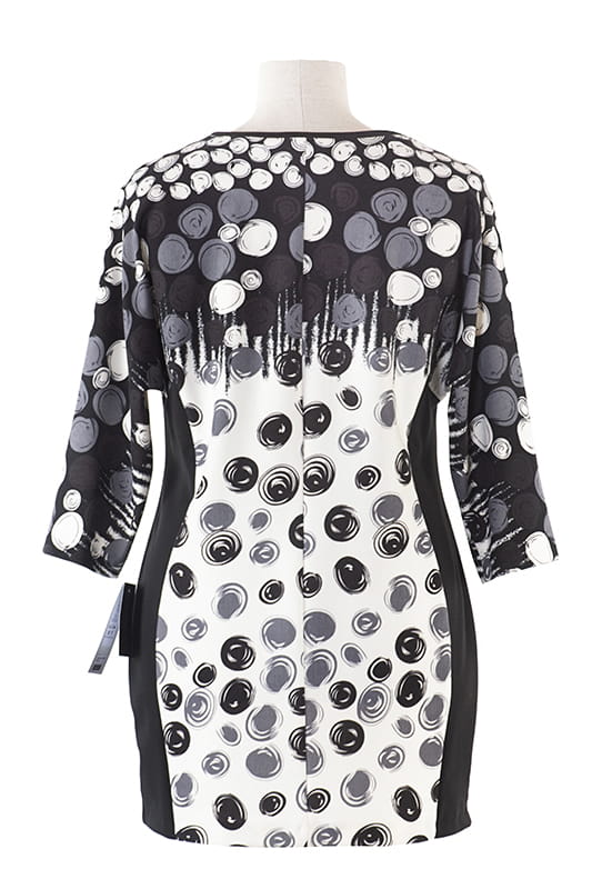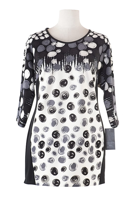 Tunika EDI wykonana została z elastycznej dzianiny w finezyjne koła. Ozdobiona czarnymi wstawkami po bokach ciągnącymi się wzdłuż sylwetki, które dają efekt optycznego wyszczuplenia. Model wykończony okrągłym dekoltem, rękawek ¾.