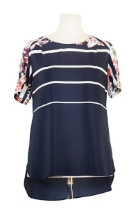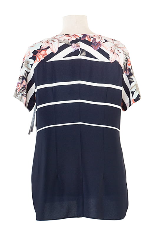 Lena to granatowa tunika z białymi pasami w poprzek i modnym kwiatowym motywem przy dekolcie. Delikatna, przewiewna, bez podszewki to najwyższe uczucie komfortu. Z tyłu dłuższa, z pęknięciami po bokach. Rękawki uszyte w raglan.