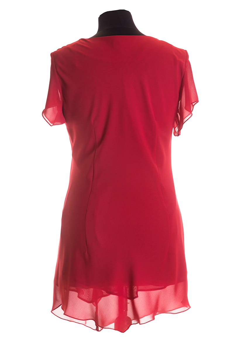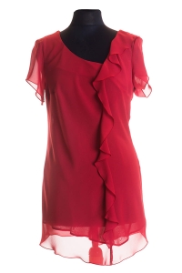 OTYLIA to efektowna, asymetryczna tunika. Otylia ma ma krótkie rękawki, dopasowany kobiecy krój i ozdobną falbankę z przodu. Fantastycznie uzupełni wiele letnich stylizacji.